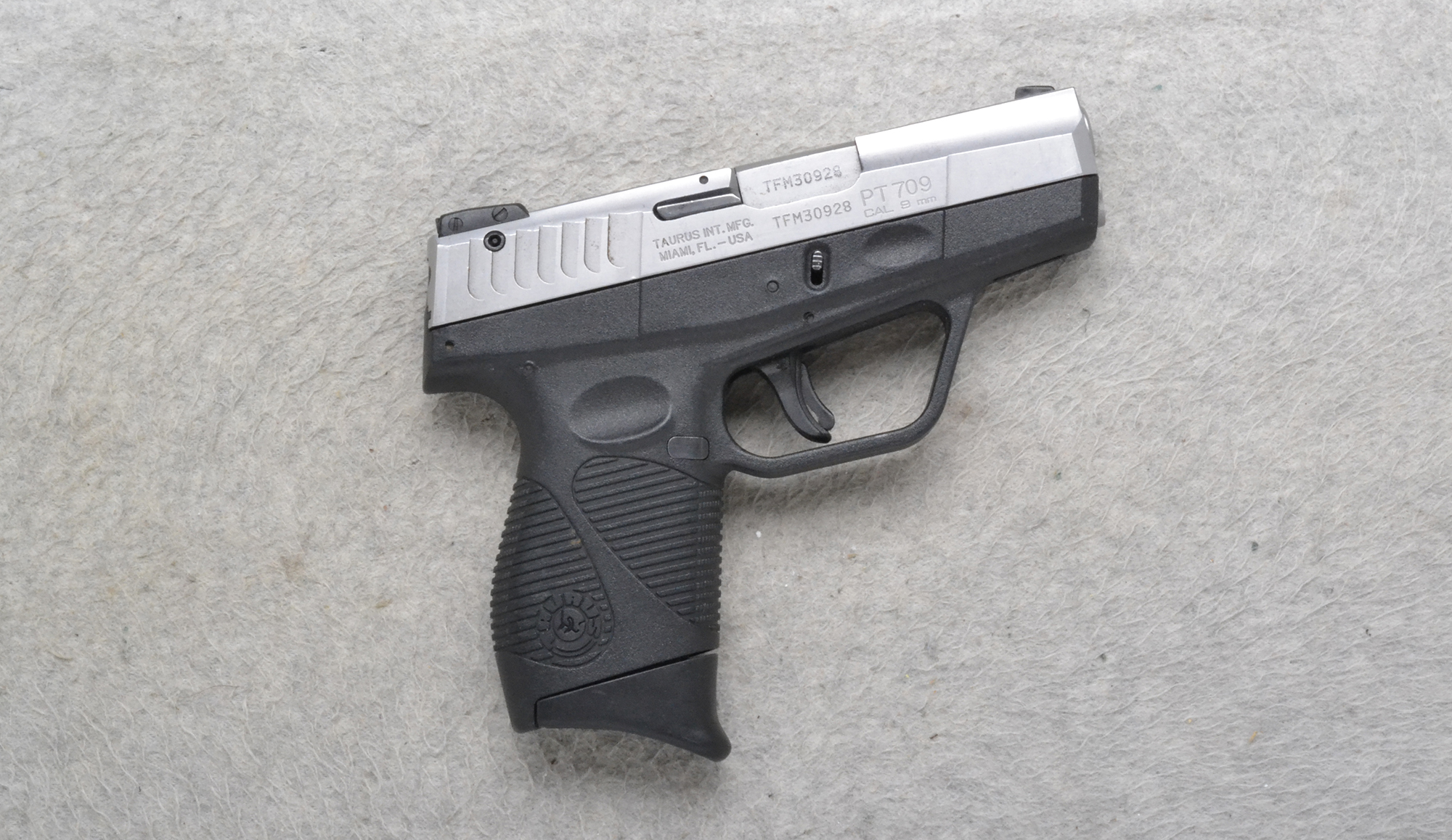 This Taurus Model PT 709 is a right hand semi-auto pistol in 9mm Cal. It has a 3.25 inch barrel with a rear serrated stainless steel slide. A blade front sight and notch rear sight with sight dots. The grip is a ribbed black polymer.