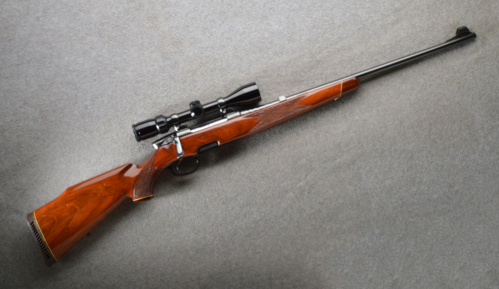 1973 Steyr-Mannlicher Model M chambered in 30-06 Springfield. This rifle was made in Austria by Steyr Arms and features a 24" blued hammer forged twist barrel with a blade front sight pinned into a serrated hooded ramped base. The rear sight is a missing from the dovetail. There are two-piece bases and rings installed with a glossy Bushnell 3-9 scope. The scope has a crosshair pattern. The stock is a one-piece skip-line checkered walnut with capped pistol grip, caped forend, Monte Carlo comb with cheekpiece, ventilated brown rubber Steyr recoil pad, and sling studs front and rear.
