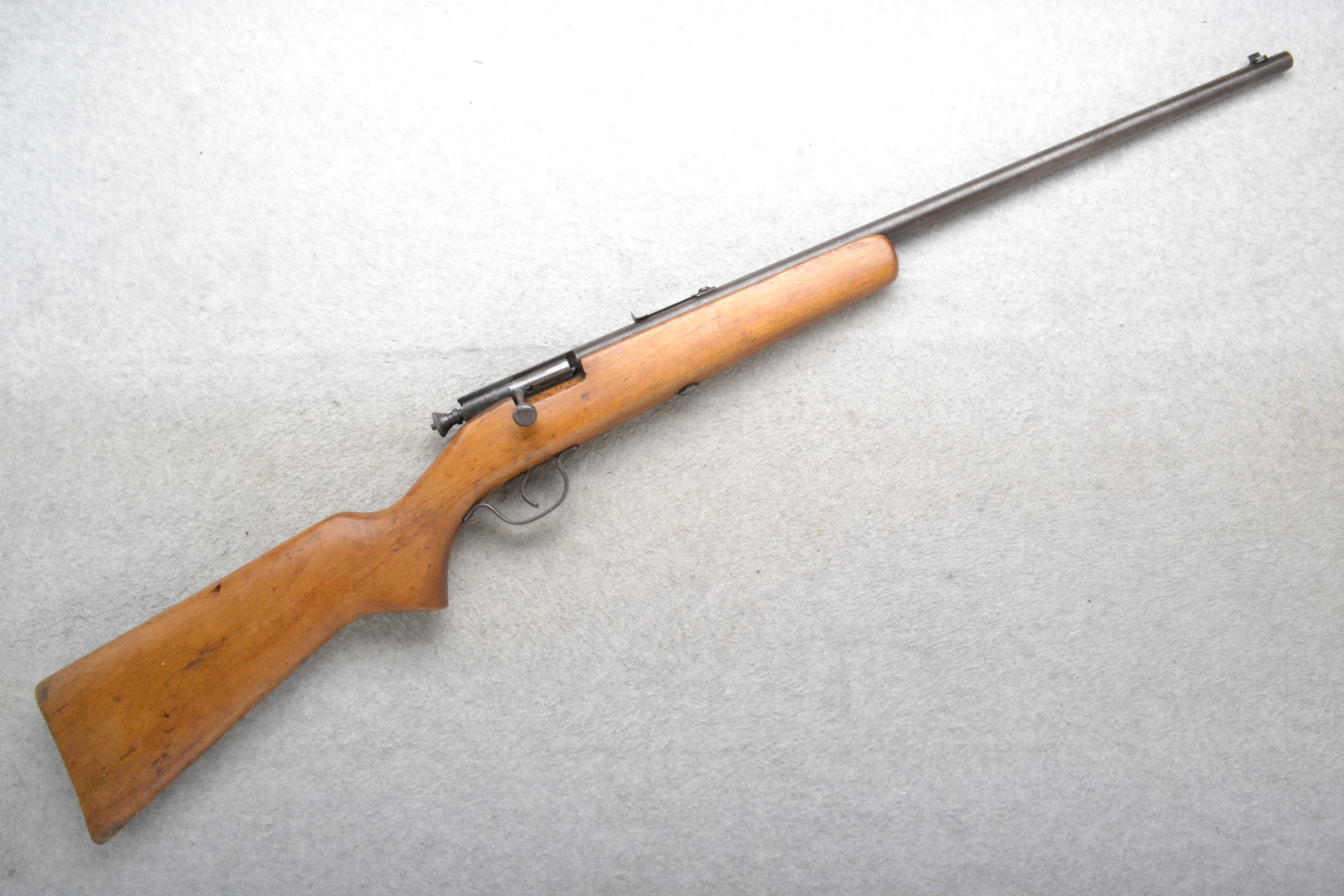 This J Stevens Model 15 is a right-hand bolt action single shot rifle in .22 Short, Long, Long Rifle Cal. It has fixed blade front sight, and adjustable notch rear sight (elevation slide is missing). The forearm is smooth hardwood. The stock is a smooth hardwood pistol grip.