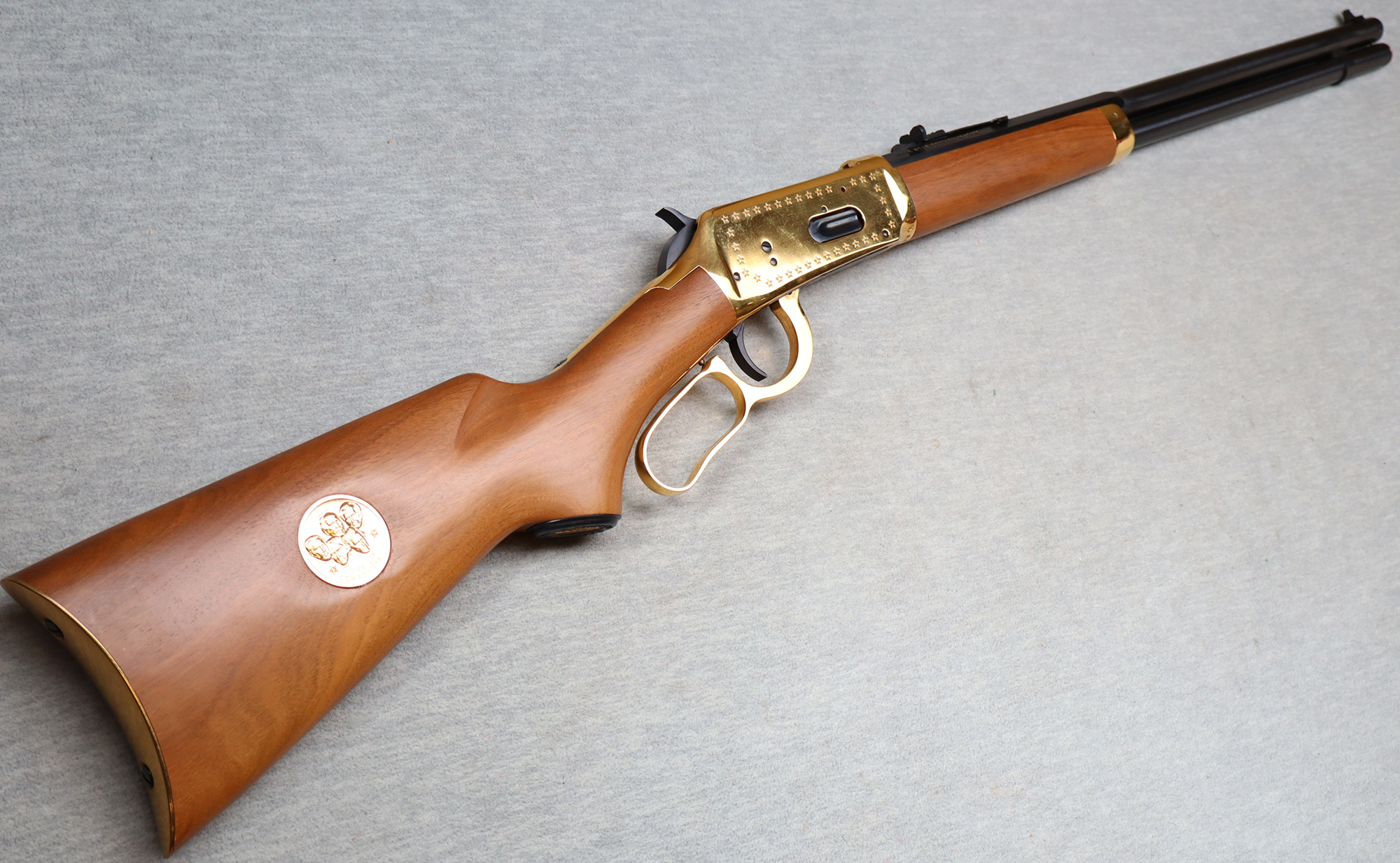 This is a Winchester 94 Lone Star Commemorative rifle. It has a gold-toned receiver with a blued round/half octagon barrel. They were manufactured in 1970 to commemorate Texas, with only 55,259 produced (total rifles & carbines). It has an adjustable rear sight and a saddle ring. Gold highlights include the receiver with engraved stars, the lever, the cap on the magazine tube, the fore tip, and the curved butt plate. They each have a Lone Star Commemorative medallion in the stock and etchings which include: TEXAS, and Under Six Flags. Markings: The left side of the barrel is marked "WINCHESTER MODEL 94 30-30 WIN. / MADE IN NEW HAVEN, CONN. U.S.A. WINCHESTER PROOF STEEL". The right shoulder of the barrel is marked "LONE STAR COMMEMORATIVE". The upper tang is marked "UNDER SIX FLAGS". The grip cap is marked "WINCHESTER REPEATING ARMS" around the circumference and "TEXAS". The sides of the receiver have stars lining the borders and on the left side, there is a star in the middle of "1845" and "1970". The right side of the buttstock has an inlay with the heads of six prominent Texans and is marked "LONE STAR COMMEMORATIVE". This example comes with the original box. Receiver surface shows some lights marks.