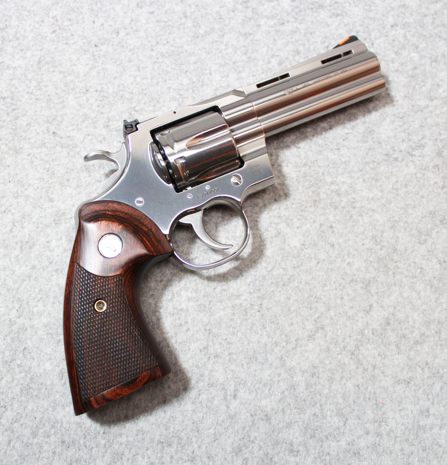 Colt Python double action pistol, chambered in .357 Magnum. It has a 4.25" vent rib barrel with full lug. The front sight is a black blade with orange insert, and the rear sight is a black adjustable u-notch. The factory target grips have Colt medallion inlays. Includes factory hard case, and manual. Free shipping to any Bass Pro Shops or Cabela's store.