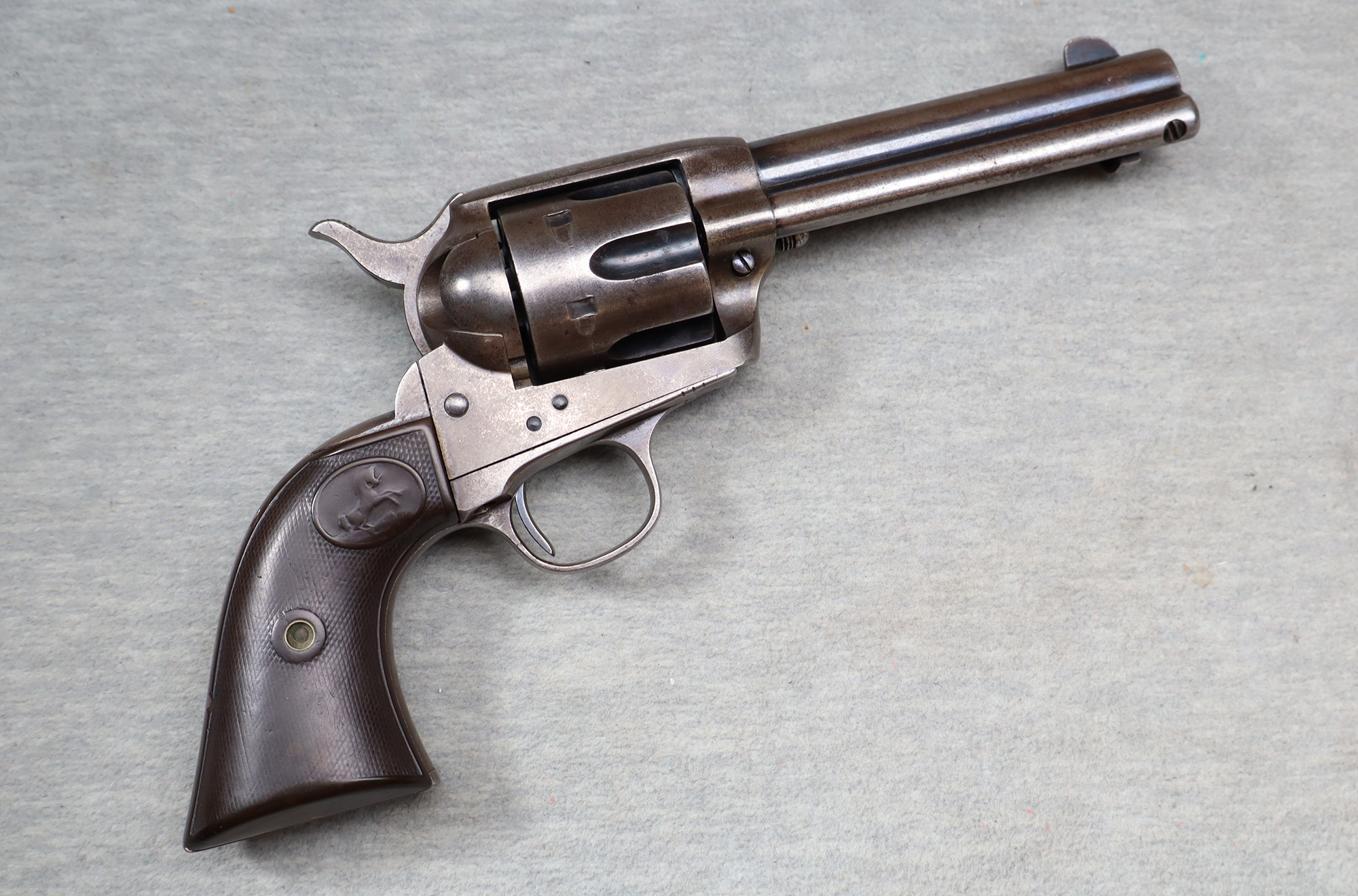 This Colt Single Action Army dates to 1909. This revolver is still in good shape dispite the finish loss. 4.75 inch barrel and six round fluted cylinder. Grips are worn and have a few dings. A classic Colt for your collection.