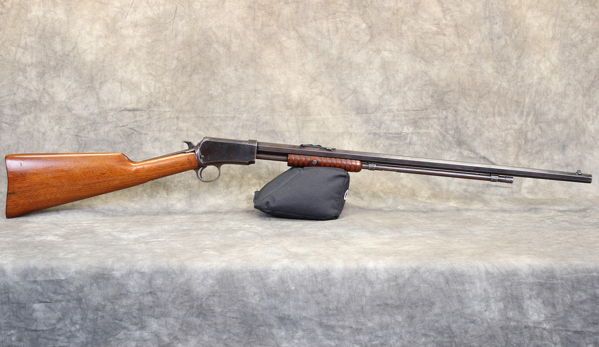 A Winchester Model 1890 rifle, presented in fair condition. This classic pump-action rifle shows noticeable wear from age and use, including finish loss and handling marks on both wood and metal. The bore shows wear but remains functional, and the action operates, though it may feel less smooth than newer examples. A well-known early rimfire design with historical appeal, suitable as a project piece or collectable.