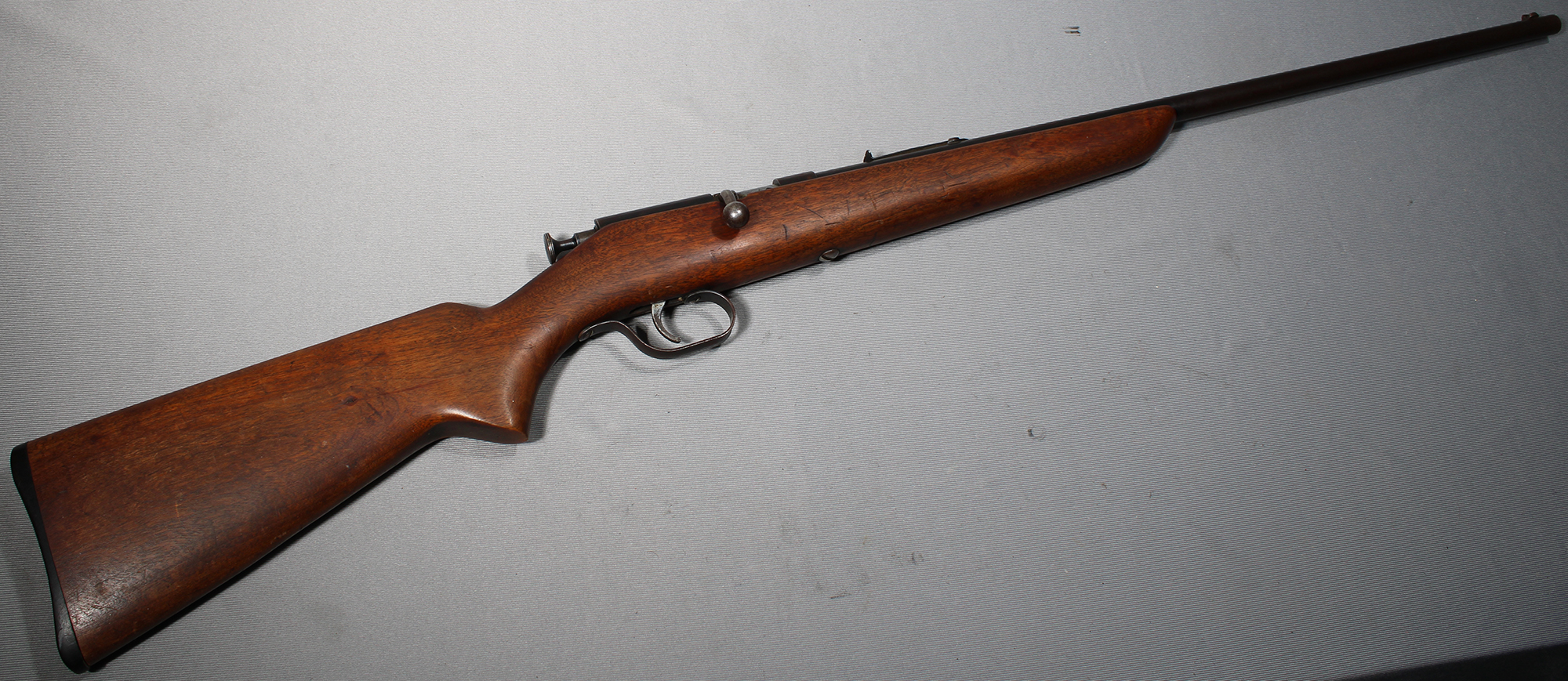A Marlin Model 100, chambered for .22 Short, Long, and Long Rifle. The rifle is in fair condition, with multiple knicks and spots of surface rust on the barrel, trigger, and trigger guard. The stock is also in fair condition, with a significant amount of knicks and scratches in the wood as well as a small crack forming on a knot in the wood on the right side of the stock. Gun Only