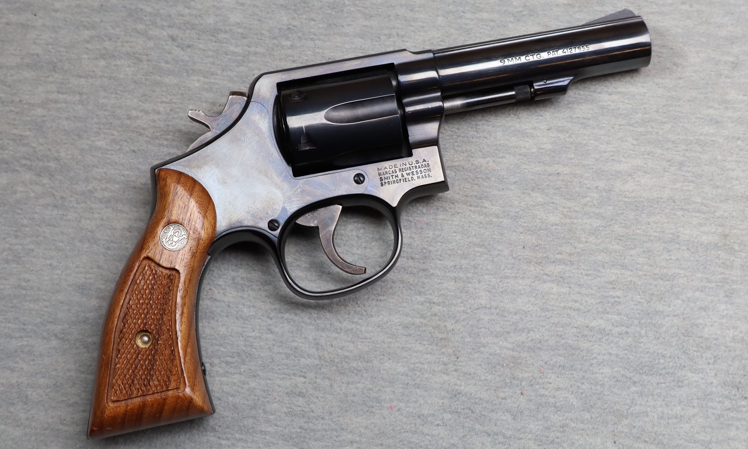 Excellent condition, light wear & handling marks. S&W 9mm revolver, 4" heavy barrel, polished blue finish, 6 shot fluted cylinder, fixed sights, double & single action trigger, checkered hammer & cylinder latch and S&W checkered wood grips. Manufactured in 1983.