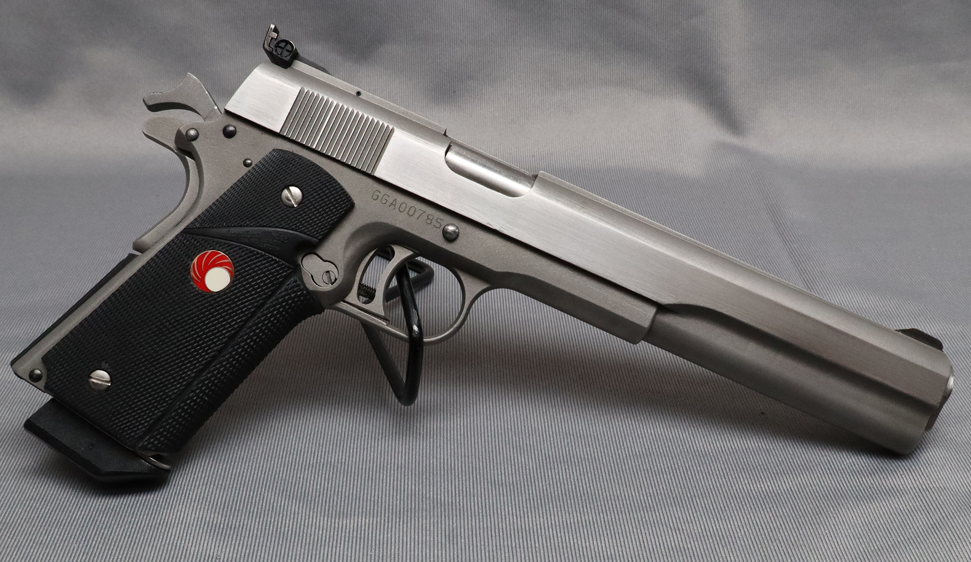 A Galena Industries made AMT Hardballer Longslide in good overall condition. The finish is in good shape overall, with some wear on the operating surfaces from use, some handling marks such as light scuffs and a few scratches and the sides of the slide almost certainly were polished at some point by a previous owner. The bore is in excellent shape overall, still bright and shiny with some signs of light use, but no major wear or corrosion. This pistol was manufactured by Galena Industries after they purchased AMT in 1998.