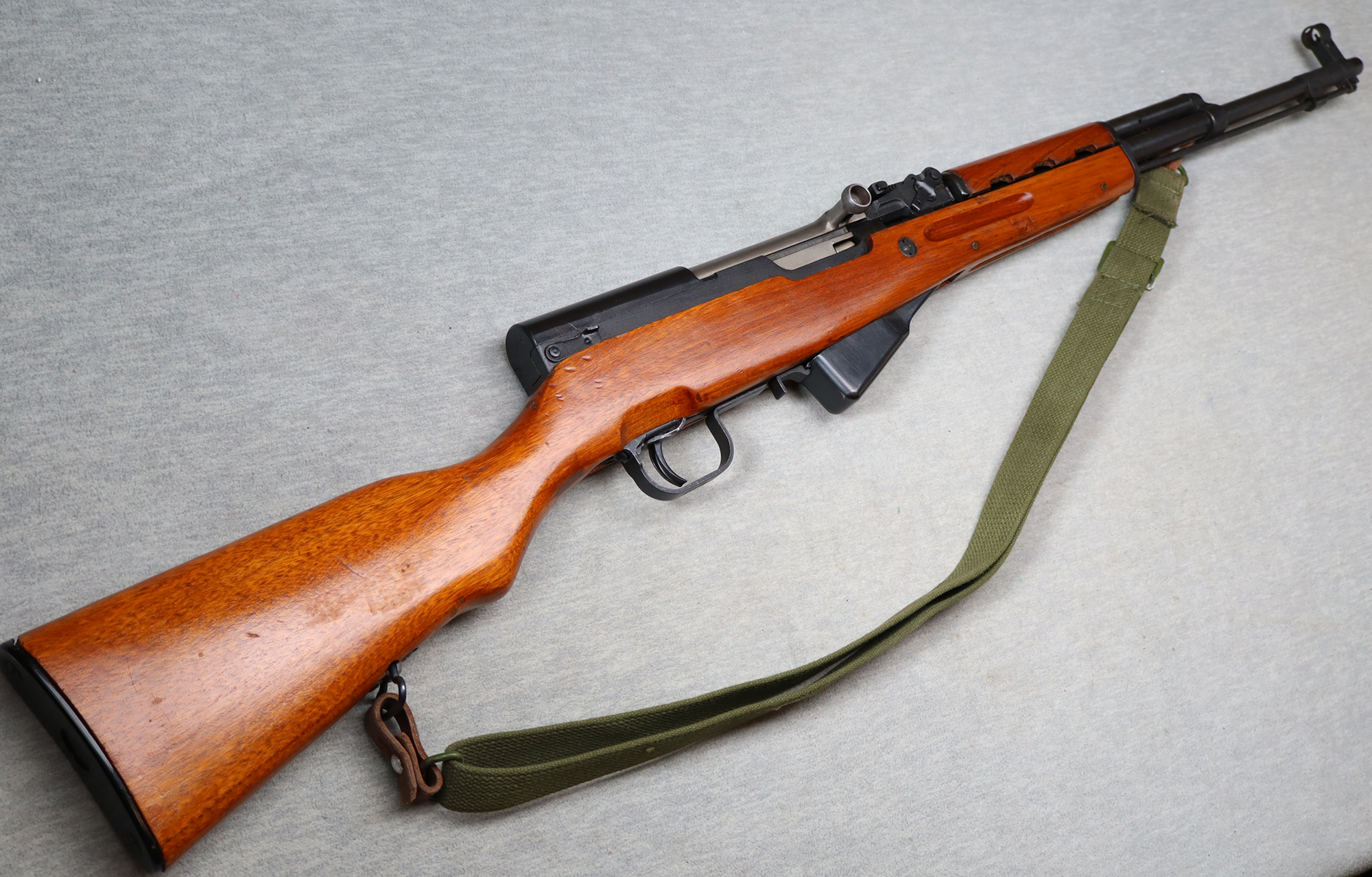 The Norinco SKS is a Chinese copy of the famous Russian SKS rifle. The Norinco SKS was first manufactured in China under the supervision of Russian Soviet military engineers, and those rifles are known as "Sino-Soviet". Later the Chinese were manufacturing the SKS on their own, constantly changing technical details and manufacturing process, so variations can be seen even between two rifles from the same factory. The major difference from the Russian SKS is the hand guard take-down lever that does not feature a tab for fingers to hold onto to rotate it. As any SKS, the rifle can be loaded by hand one round at a time or with stripper clips. Today SKS rifles are not used anymore by Chinese military except for ceremonial purposes. Importing of Norinco firearms in the US was banned in conjunction with 1993 and 2003 U.S. trade sanctions. This example appears to be numbers matching from the visible marking, but it does not have a bayonet. Finish is good and the rifle comes with a canvas sling attached.
