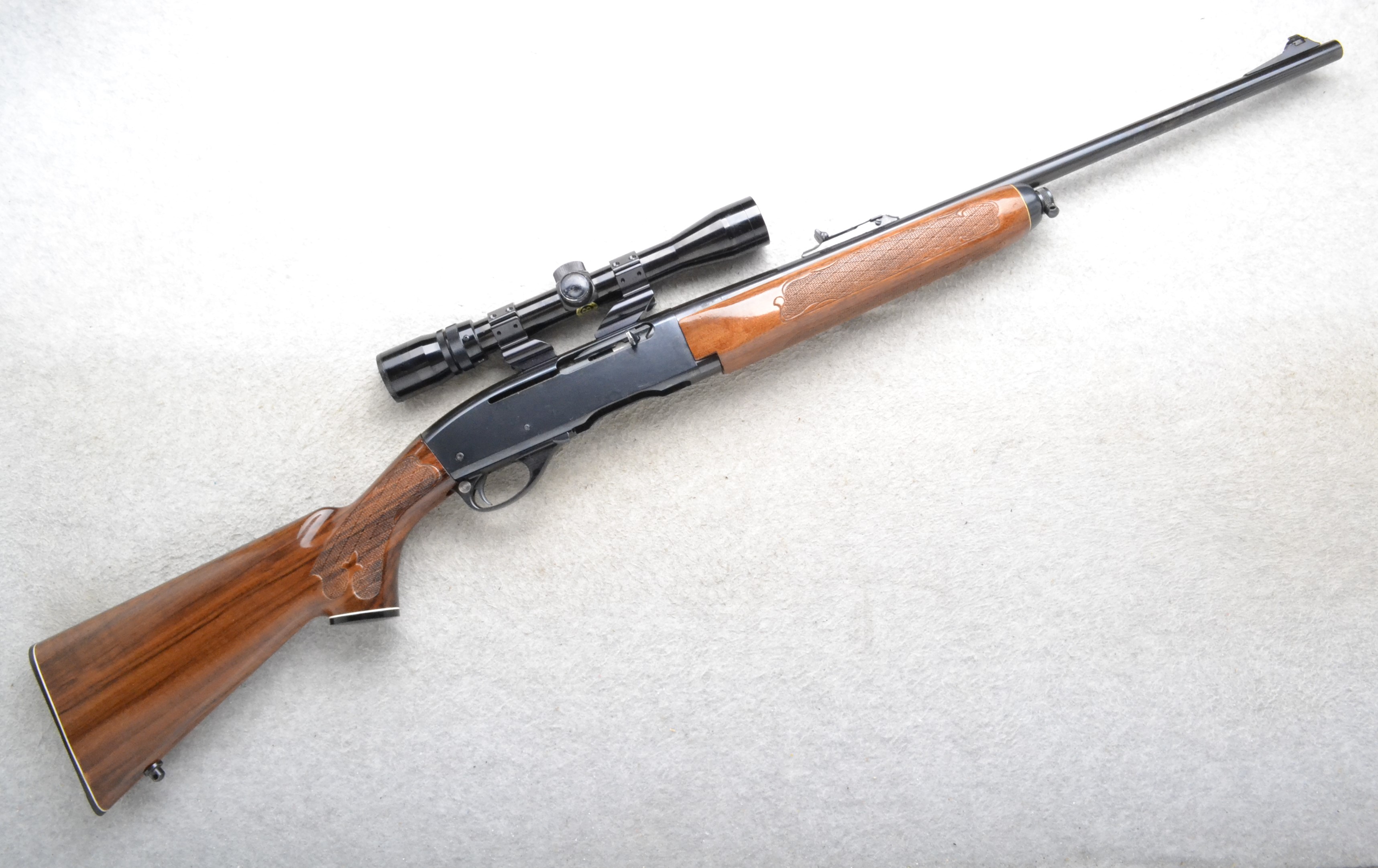 This Remington 742 is a right-hand semi-auto rifle in .30-06 Springfield Cal. The barrel is 22 inches long. It has a raised blade front sight, an adjustable notch mid-sight, and a Bushnell Sportview 3-9x32mm scope with lens covers. The forearm is checkered hardwood. The stock is a smooth hardwood pistol grip with checkered side panels, a cap, and a checkered metal butt plate. It includes two magazines. .30-06 Springfield