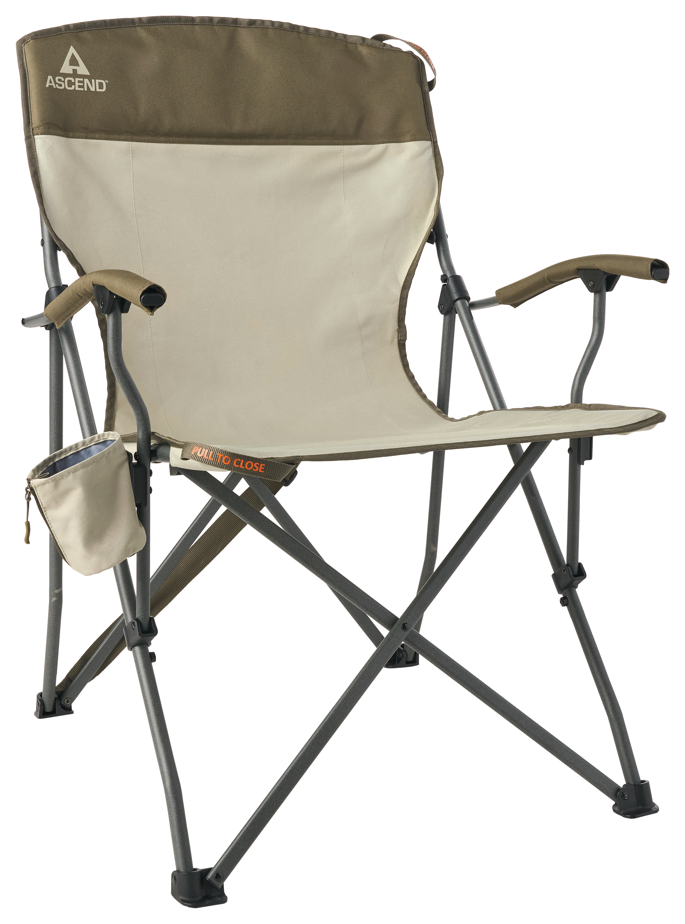 Comfortable and supportive, the Ascend® Rover Hard Arm Folding Camp Chair makes it easy to sit back and enjoy the outdoors in easy comfort. Lightweight and portable, this sturdy design pairs a sturdy powder-coated steel frame with a durable and water-resistant polyester seat and backrest. The Ascend QuickLock molded latch and easy-close handles make it easier to fold the chair up at the end of the day for easier transport. Hard armrests provide a resting spot for your forearms and offer a solid, supportive surface when getting in and out of the chair. Movable cupholder fits on either armrest so you can sip drinks from either side. Integrated carry strap makes hauling this comfy, go-anywhere chair from the campsite to the sidelines to the backyard a breeze. Comes with a carry bag with shoulder strap for easy carrying. Side cup holder.