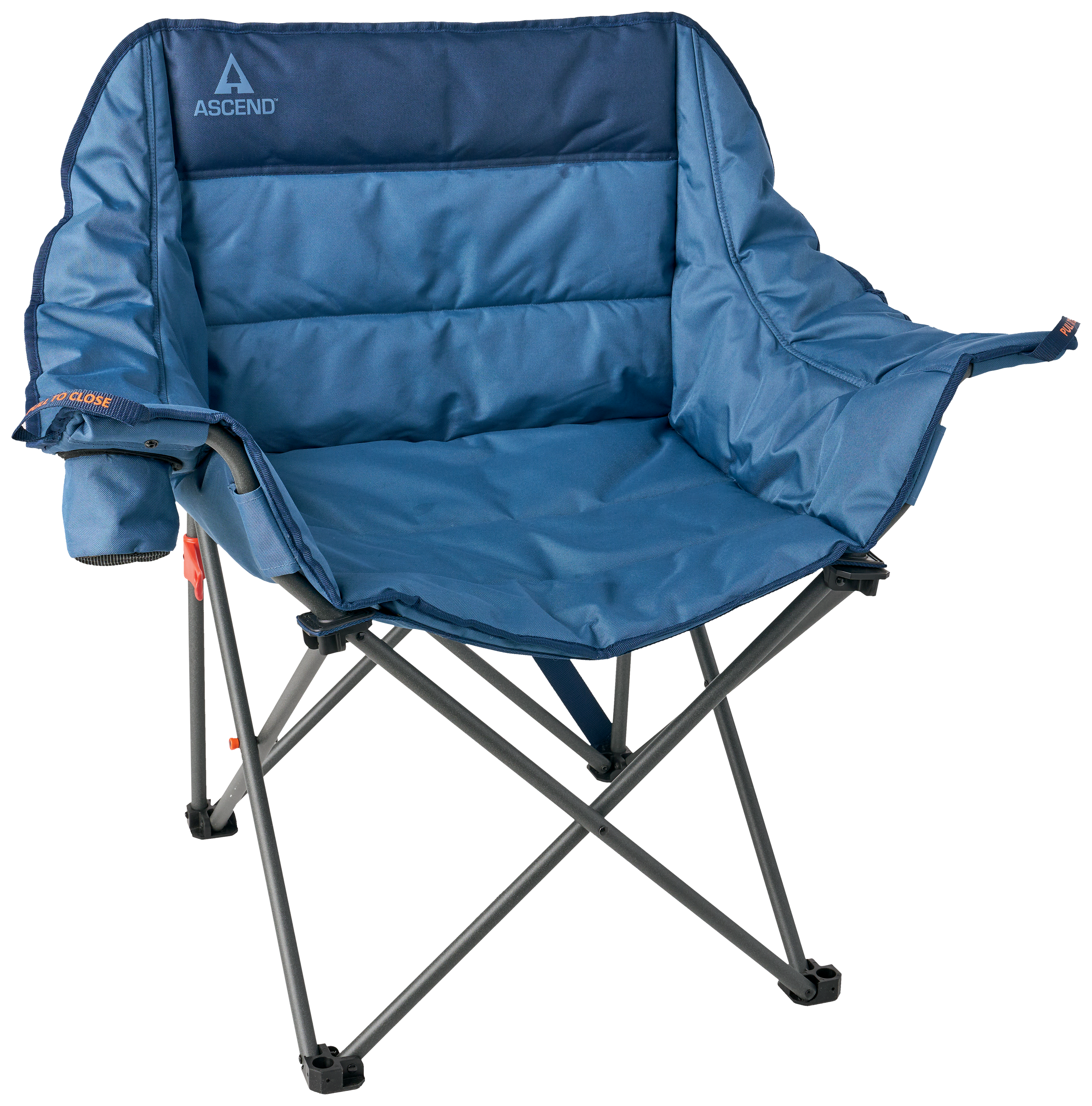 Be comfortable wherever your outdoor adventures take you in the Ascend® Traveler Padded Chair. Made of a water-resistant polyester, this folding camp chair features fully padded and cushioned armrests, back, and seat to boost comfort. Built on a sturdy powder-coated steel frame, this folding design features the Ascend QuickLock molded latch and easy-close handles for easier folding. Integrated carry strap makes hauling this comfy, go-anywhere chair from the campsite to the sidelines to the backyard a breeze. Built-in cup holder. Includes zip carry bag for easier transport and storage.