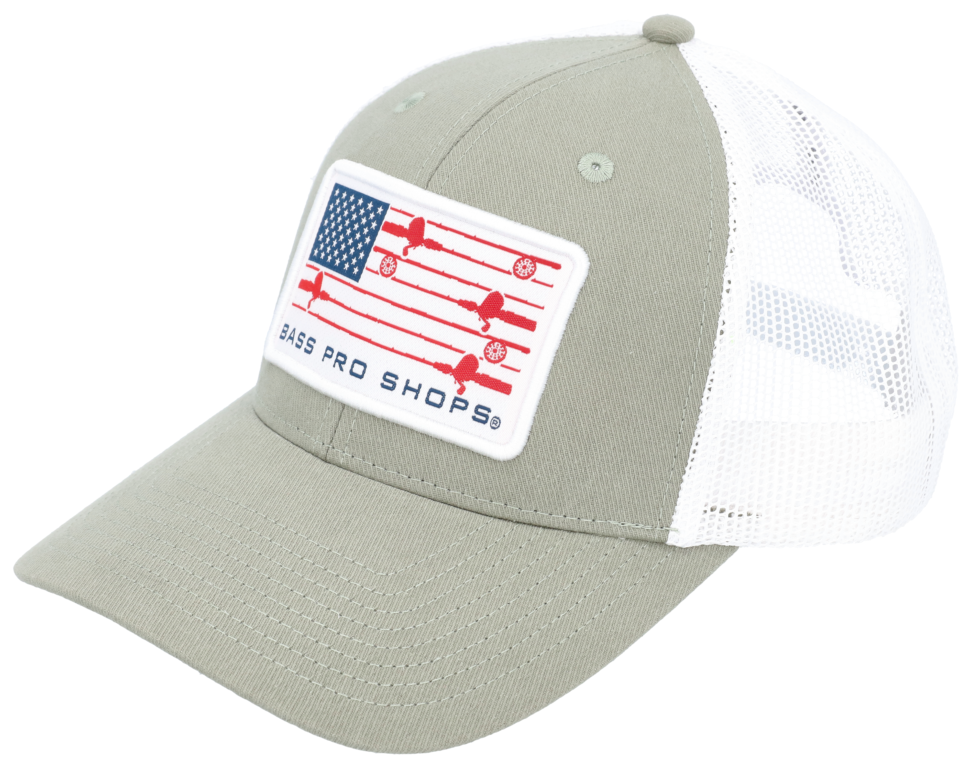 Wear your values with the Bass Pro Shops® Logo Flag Mesh-Back Snapback Cap. This Bass Pro cap has an American flag-style front patch with fishing rods for stripes above a Bass Pro Shops wordmark. The mesh back provides great airflow, and the snapback closure lets you personalize the fit. Imported.