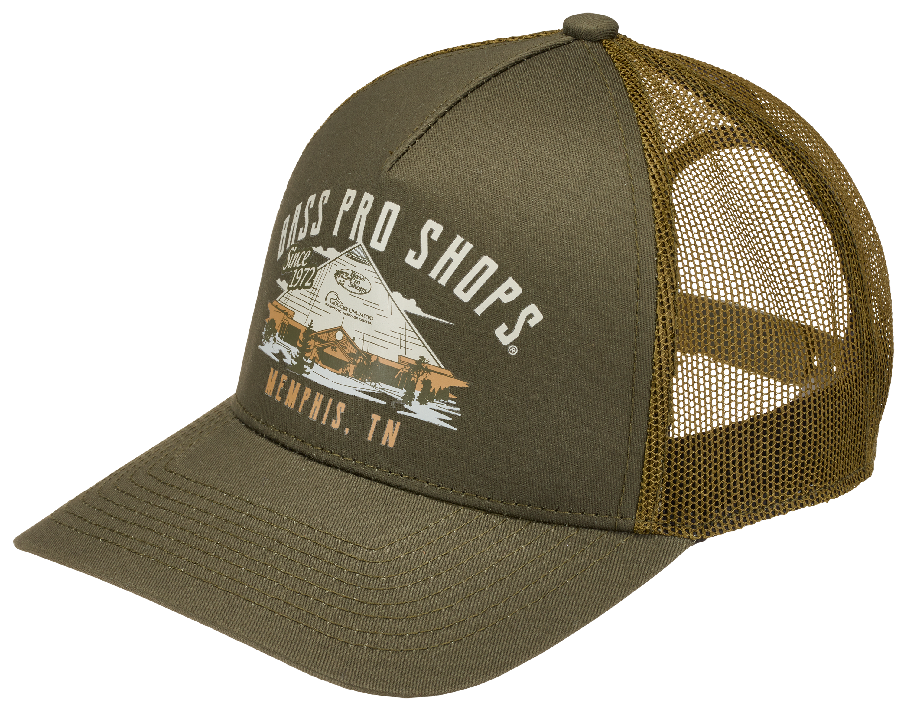 Give a nod to an iconic destination with the Bass Pro Shops® Memphis, TN Pyramid Mesh-Back Snapback Cap. This Bass Pro cap displays the famous Pyramid screen-printed across the front in fine detail, with a Bass Pro Shops wordmark and "Memphis, TN" surrounding the Pyramid. The mesh back provides great airflow, and the snapback closure lets you personalize the fit. Imported.