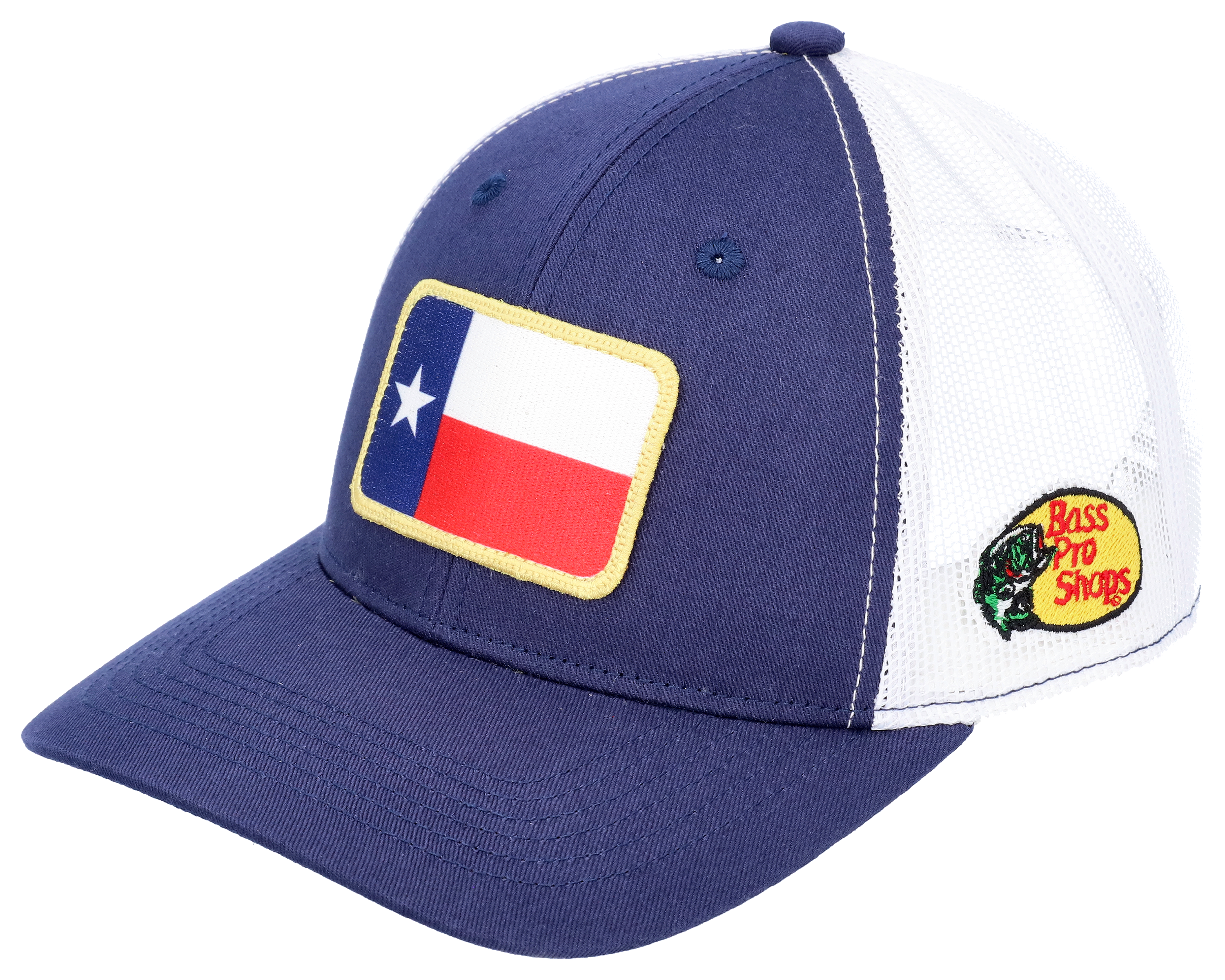 Show your Florida pride with the Bass Pro Shops® Texas Flag Patch Snapback Cap. This Bass Pro cap has a Texas state-flag patch over solid front panels. The mesh back provides cooling airflow, and a Bass Pro Shops side logo gives a nod to the outdoor leader. Adjustable snapback closure. Imported.
