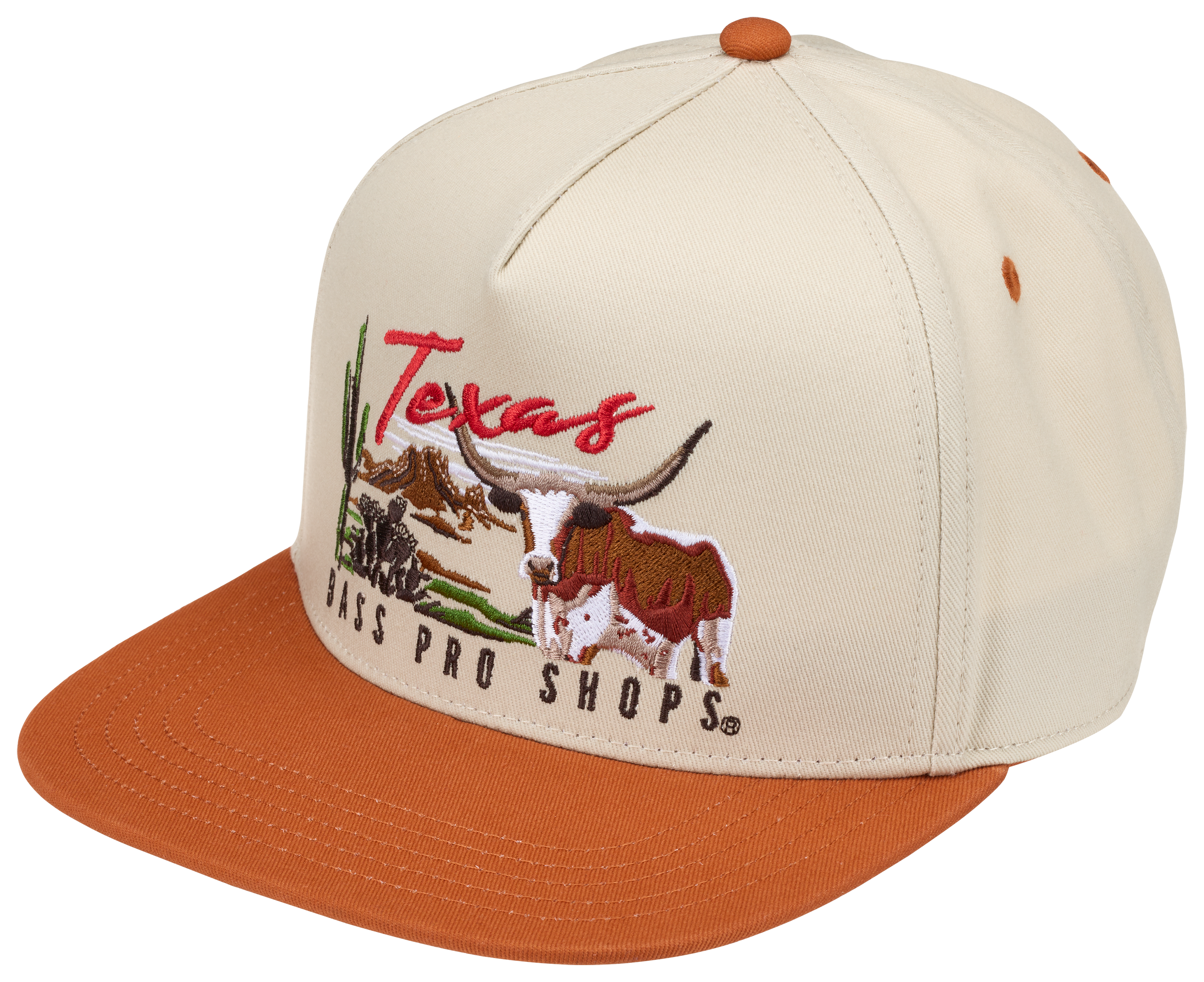 Celebrate the Lone Star State with the Bass Pro Shops® Texas Longhorn Landscape Flatbill Cap. This Bass Pro cap will turn heads with its incredibly detailed embroidery showcasing Texas beauty. The state name and a Bass Pro Shops wordmark surround the scene. The color-matched bill, grommets, top button, and adjustable snapback closure complete the distinctly Texan style. Imported.