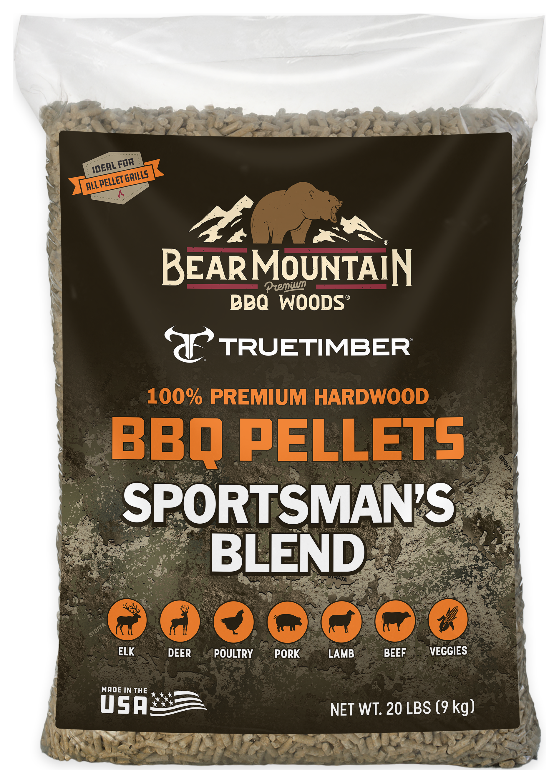 A great choice for hunters and other sportsman, Bear Mountain® BBQ Woods TrueTimber® Sportsman's Blend Premium Hardwood BBQ Pellets deliver great cooking performance and flavor. This blend of 100% premium hardwoods helps any pellet grill deliver rich, smoky flavor every time, adding classic smokiness with a hint of sweetness. Crafted by the experts at Bear Mountain and TrueTimber for sportsmen, these pellets add the perfect smoky flavor boost to elk, deer, poultry, duck, pork, lamb, beef, veggies, and more. All-natural pellets contain no fillers or binders. 20-lb. bag.