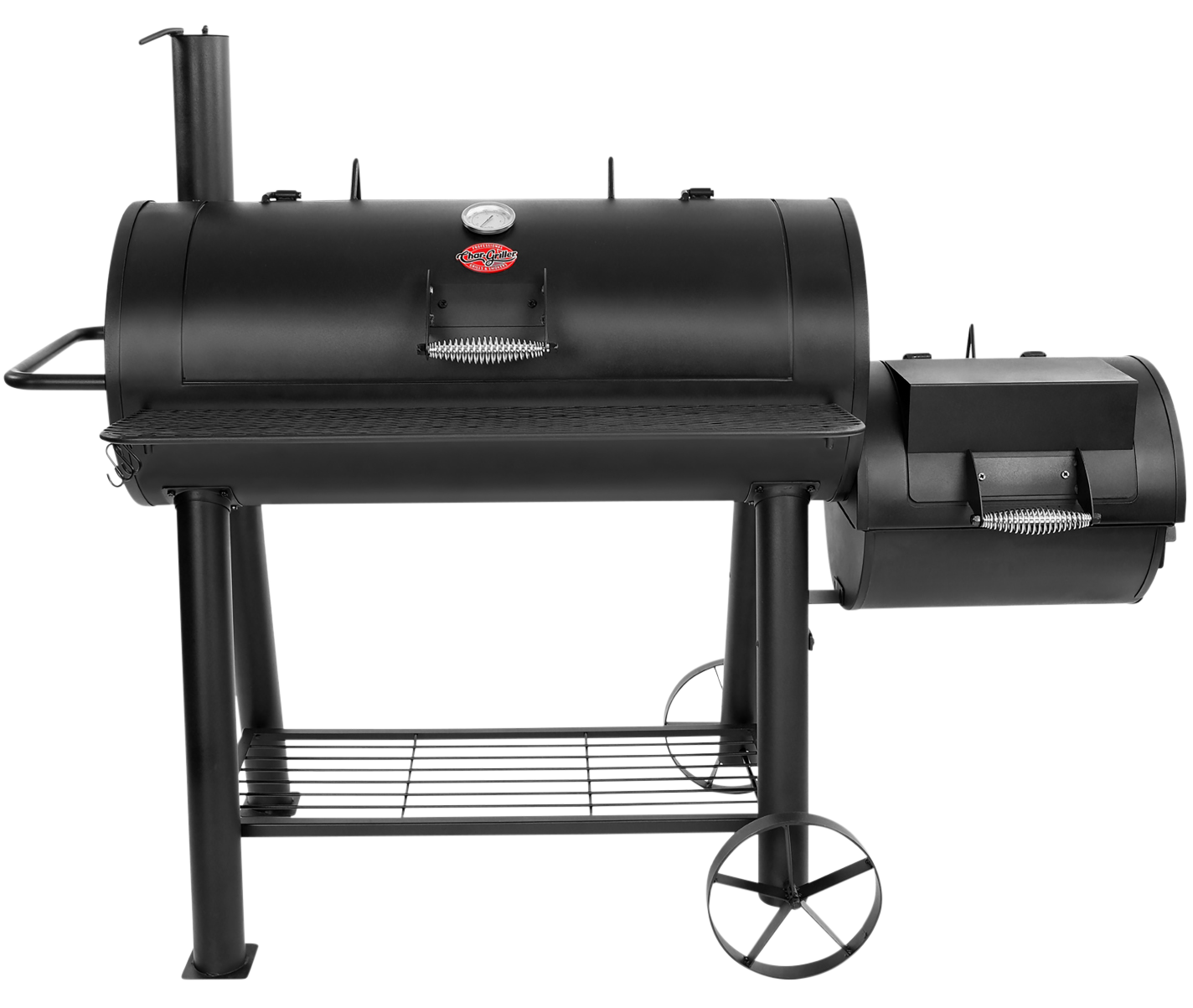 Versatile and hardworking, the Char-Griller® Competition Pro® Barrel Grill and Offset Smoker offers great backyard cooking versatility. A great solution for a mess of burgers or a low-and-slow brisket, this grill and smoker delivers delicious barbecue flavor. Made of heavy-duty steel for long-lasting use, this grill features an insulated body to hold heat and smoke inside for superior grilling and smoking performance as well as less fuel demand. The Texas-style offset fire box helps deliver great smoking flavor and food texture. Dual damper control help you achieve just the right airflow for perfect smoking or grilling to ensure tender, juicy, and flavorful food every time. Locking in flavor and enhancing airflow in the cooking chamber, the grill's expanded metal cooking grates offer 1,010 sq. in. of cooking space so you can fix BIG batches of barbecue goodies. Front shelf with incorporated utensil hooks. Bottom shelf for storage. Built-in wheels and side handle for easier mobility. 52"H x 66"W x 33"D.