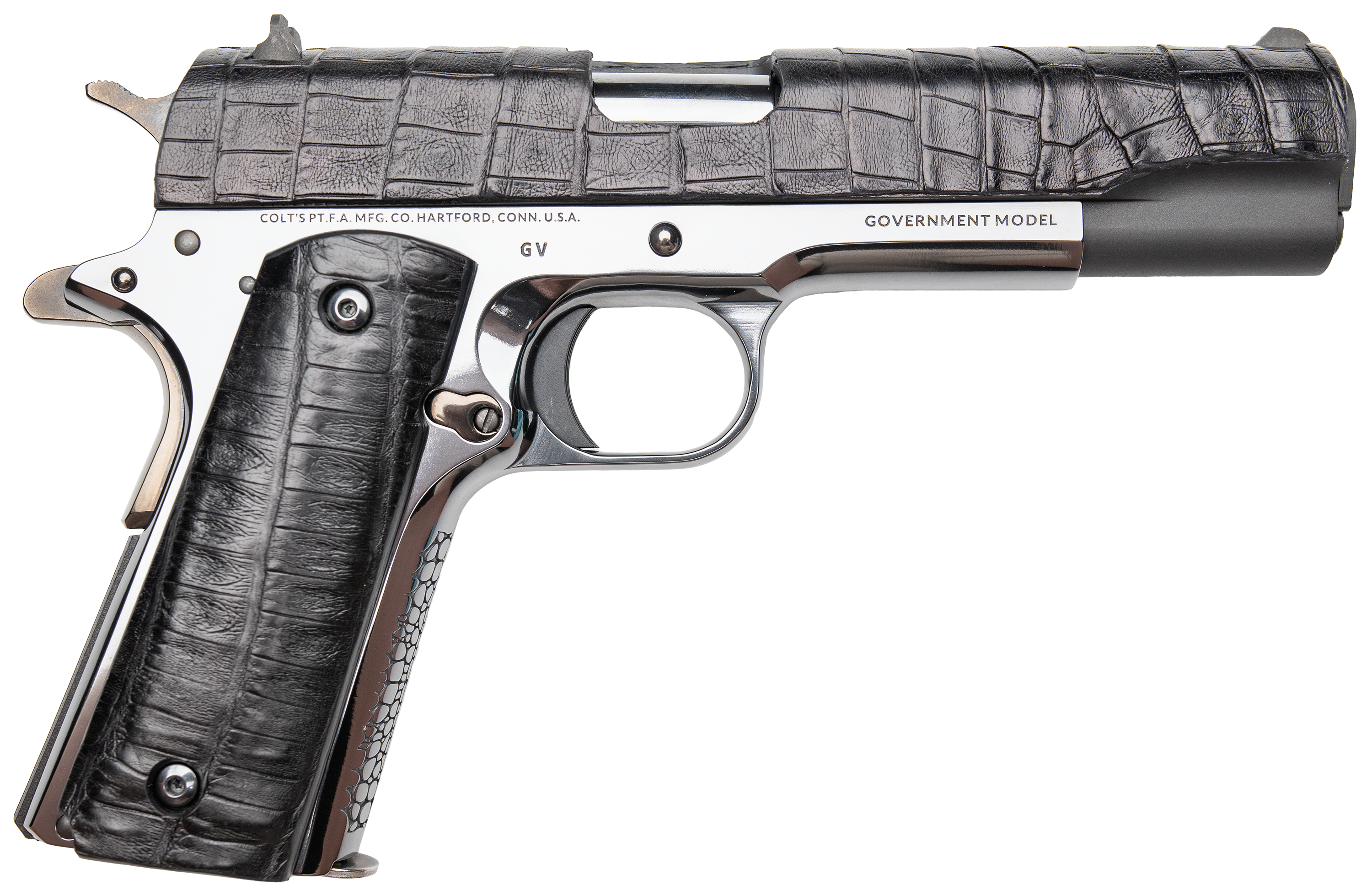 Part of a limited edition of just 300, the CNC Firearms Gator 1911 Semi-Auto Pistol combines the best of John Browning's legendary design with unique materials to create a one-of-a-kind handgun. Its sleek black DLC finish provides a bolt look while both the slide and grips are wrapped in genuine black alligator leather to create a totally unique aesthetic. The DLC frame is enhanced with scaled engraving on the magazine well, adding depth and texture to the design. The front of the pistol if crowned with a diamond front sight. Every detail has been crafted to enhance its distinctive design, making the Gator 1911 a true statement piece. Every pistol comes with a Custom & Collectable Firearms challenge coin and certificate of authenticity.