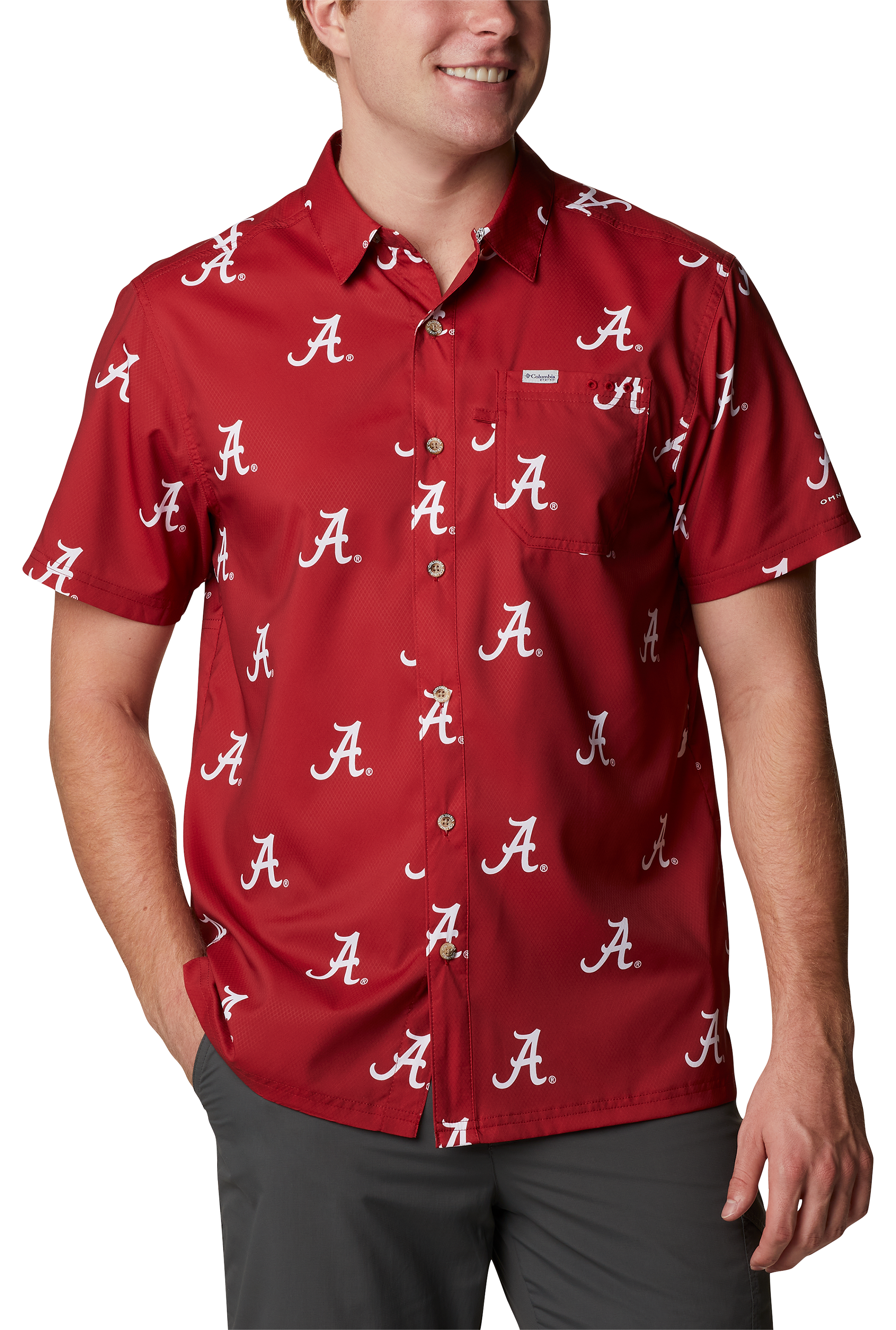 When you wear the Columbia® Collegiate PFG® Super Slack Tide™ Shirt for Men, you'll look and feel cool, and you'll show off a fun tropical pattern along with the logo of your favorite college team. A built-in ventilation system lets cooling breezes blow right in. Omni-Shade™ UPF 40 sun protection keeps your skin safe from the burning rays. This great-looking fishing shirt from Columbia is part of the Performance Fishing Gear lineup, so it's a great choice for fishing the day away. Other great features include a neat-looking button-down collar and a sunglasses cleaning patch. Made of comfortable, breathable 100% polyester. Regular fit. Center back length: 30". Machine wash. Imported. Manufacturer style #: 1892201.