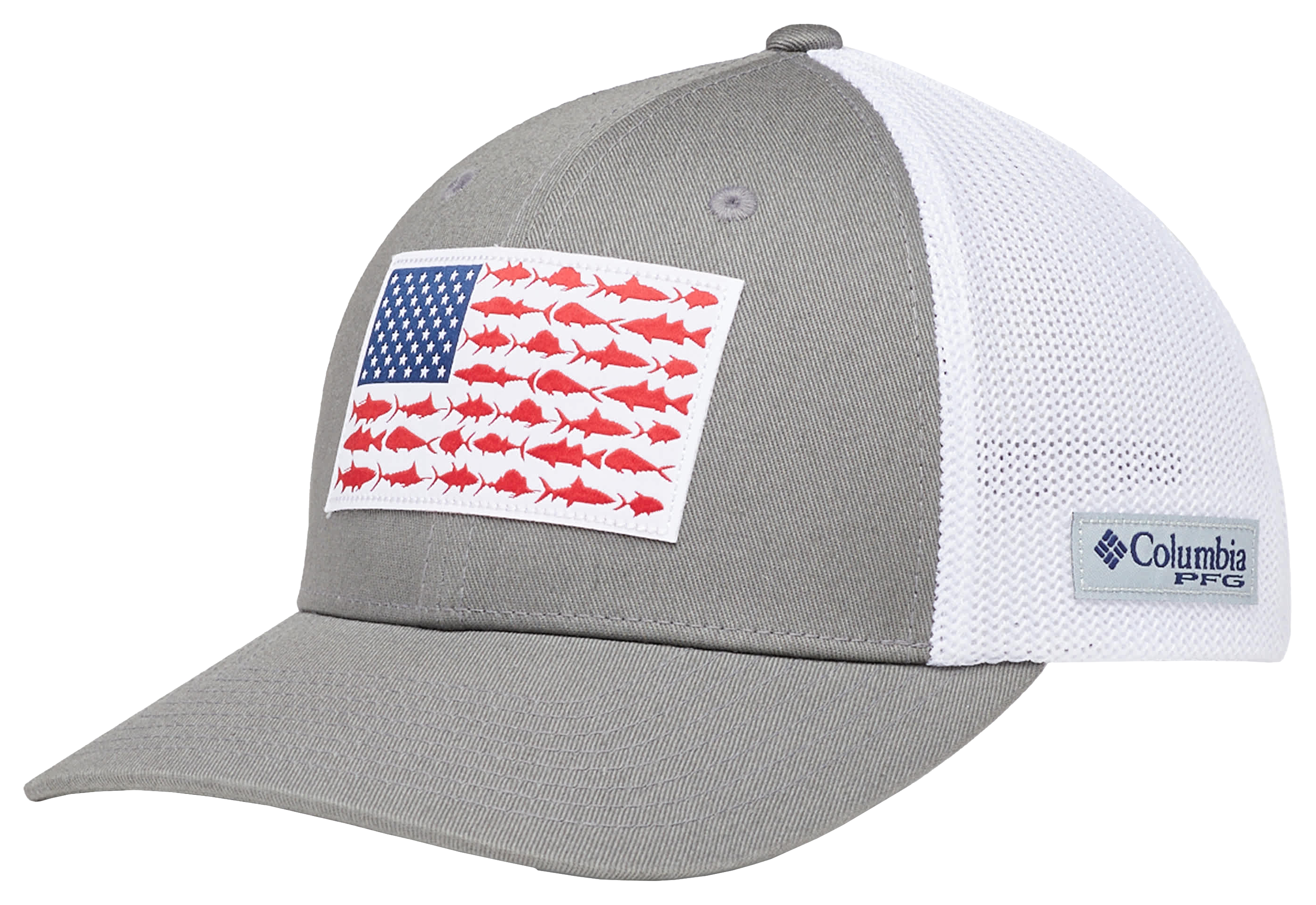 The Columbia® PFG® Mesh™ Fish Flag Ball Cap is a lightweight, breathable hat with woven spandex mesh for cool comfort and a secure fit. Featuring an ergonomic design and signature FlexFit® technology, this fishing hat is the perfect fit for your time on the water. The Columbia PFG Mesh Fish Flag Ball Cap features an stylized flag patch whose stripes are formed by saltwater game fish. A "PFG/Performance Fishing Gear" patch accents the back. 98% cotton/2% polyurethane. Imported. Manufacturer style #: 1836811.