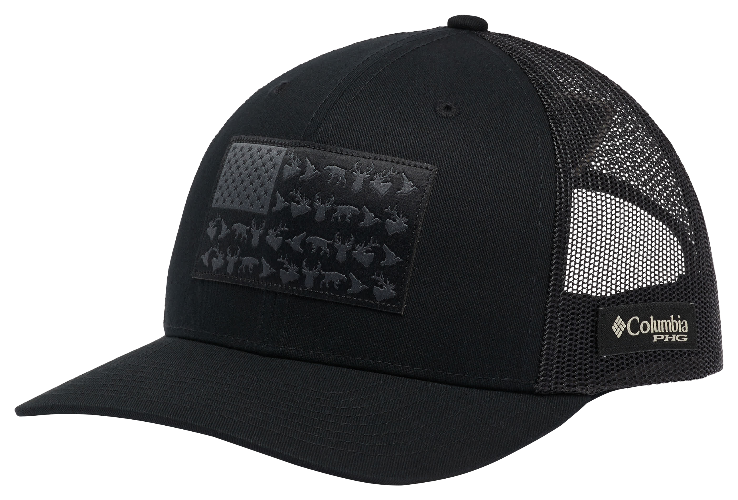 With its makeshift American flag patch, which displays stars and stripes made of wild game, the Columbia® PHG Hunt Flag Mesh Snap Back Cap shows others that you're a proud patriotic hunter! The front is made of 100% cotton, and the back is made of 100% polyester mesh. The lining is made of 100% polyester Coolmax® material, which is moisture wicking and highly breathable for maximum comfort in the heat. The built-in Flexfit® technology delivers a perfect fit that feels great all day long. Thanks to its trucker-style design with breathable PHG Mesh™ in back, this Performance Hunting Gear men's cap from Columbia delivers nonstop airflow. Columbia logo label at side and a PHG patch in back. Plastic snapback closure. Imported.