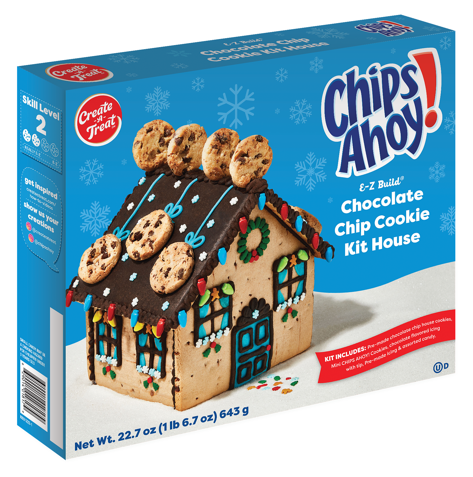 With the Create-A-Treat Chips Ahoy Gingerbread House Kit, you can start a new and fun family tradition. Using everyone's favorite cookies and the E-Z Build® tray, your family will build a wonderful cookie house together – one you know everyone will love to nibble at. This kit from Create-A-Treat includes pre-baked chocolate chip house cookies, 1 mini Chips Ahoy cookies packet, 1 pre-made chocolate-flavored brown icing pouch, 1 pre-made blue icing pouch, 1 decorating tip, and an assortment of colorful candies. Recommended for ages 3 and up.