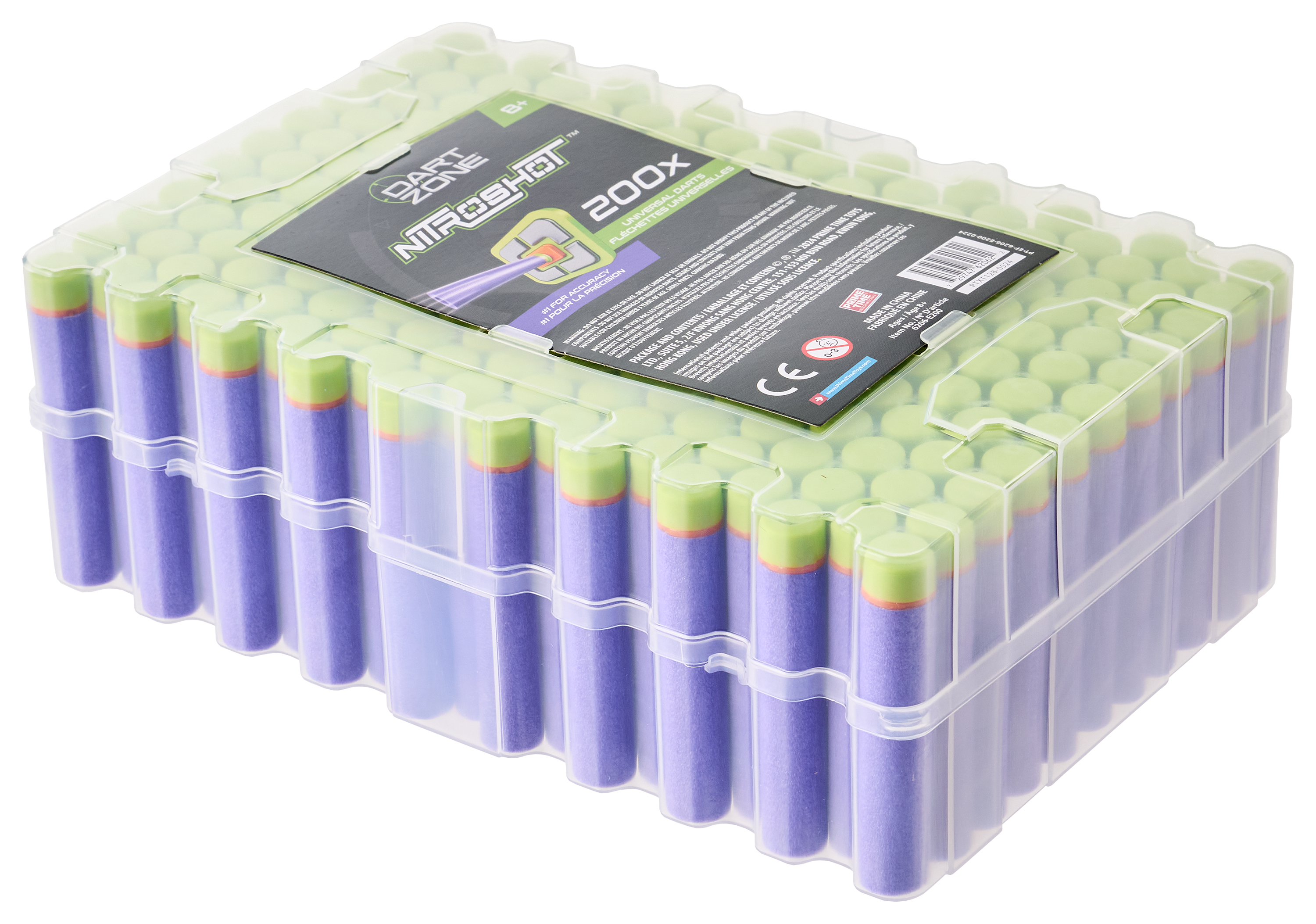 Ready, set, BLAST! Give your kids the gift of foam-blasting fun with the Dart Zone® Nitroshot Foam Darts. These standard-length darts are compatible with almost all standard-length foam dart blasters. Plus, they're engineered for pin-point accuracy, and they excel at long distance shooting. In fact, the experts at Dart Zone have shot these darts out to a staggering distance of 95'. The Nitroshot play darts from Dart Zone are soft, lightweight, and completely safe. 200-count foam darts. Recommended for ages 8 and up.