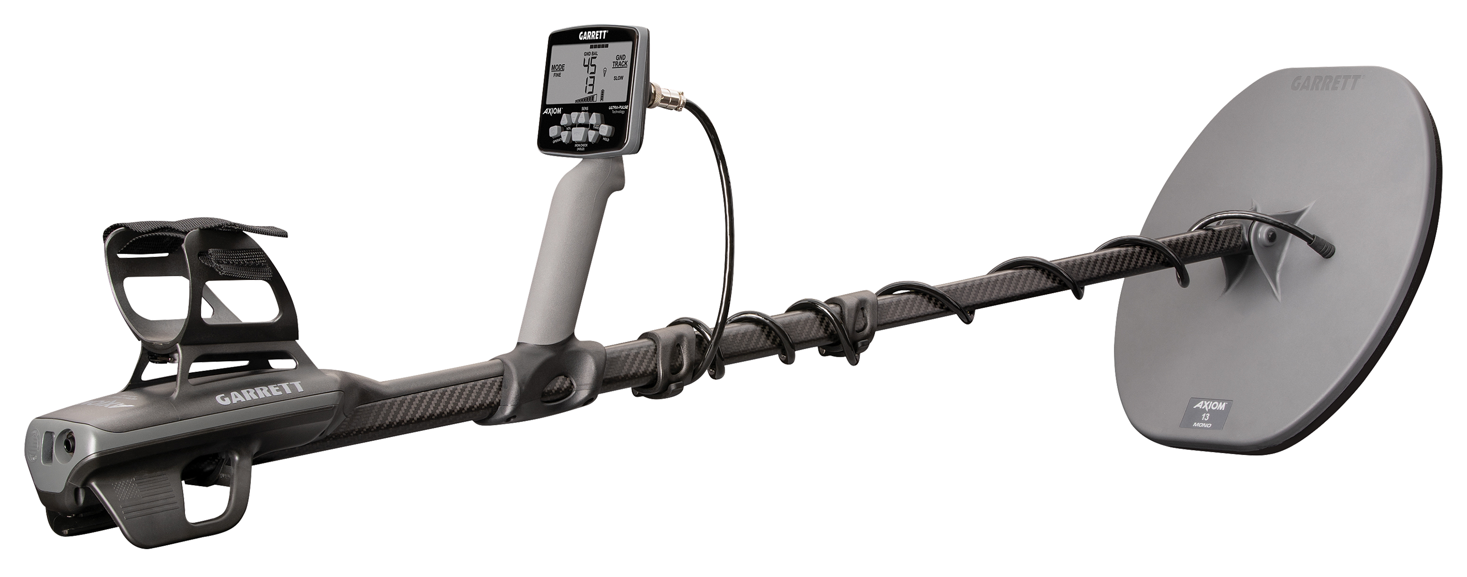 The Garrett Axiom Metal Detector with MS-3 Headphones gives you absolute performance on gold of all sizes. Featuring ULTRA-PULSE Technology, advanced pulse timings provide enhanced sensitivity and complete versatility in the most extreme mineralized soils and in saltwater. Choose from 4 settings, each ideally engineered for finding all types of gold, from larger nuggets to sub-gram pickers. The Axiom also includes TERRA-SCAN, an advanced system that provides independent dual-channel ground balance that covers the full range of mineralization, from heavily mineralized magnetic ground, to saltwater, and everything in between. The IRON CHECK feature helps you audibly identify iron targets with the Axiom when using a DD search coil. This Garrett metal detector has a built-in, high-capacity lithium-ion battery for a battery life of about 16 hours on full charge, about double the length offered by standard prospecting detectors. Extend your time in the field by about 6 hours with the included Booster Pack that holds 8 AA batteries. PWM Audio or VCO Audio options. The Garrett Axiom Metal Detector with MS-3 Headphones includes: Axiom pulse induction detector, MS-3 wireless headphones, 13" DD search coil, 11" mono search coil, soft travel pack, Axiom battery booster pack, and charging cables.