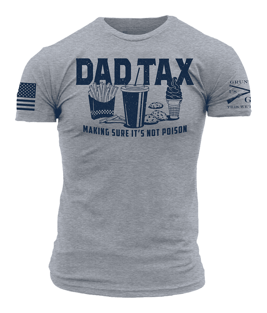 The Grunt Style Dad Tax Short-Sleeve T-Shirt is a must-have for patriotic dads! This funny graphic tee serves as a reminder of dads' selfless sacrifices to care for and defend their loved ones. Made out of 100% cotton that's been combed and ring spun, this men's shirt from Grunt Style is extra soft for all day comfort. Features include a ribbed collar that holds its shape, durable double-needle stitching, and a tagless design for itch-free comfort. Machine wash cold, tumble dry low. Imported.