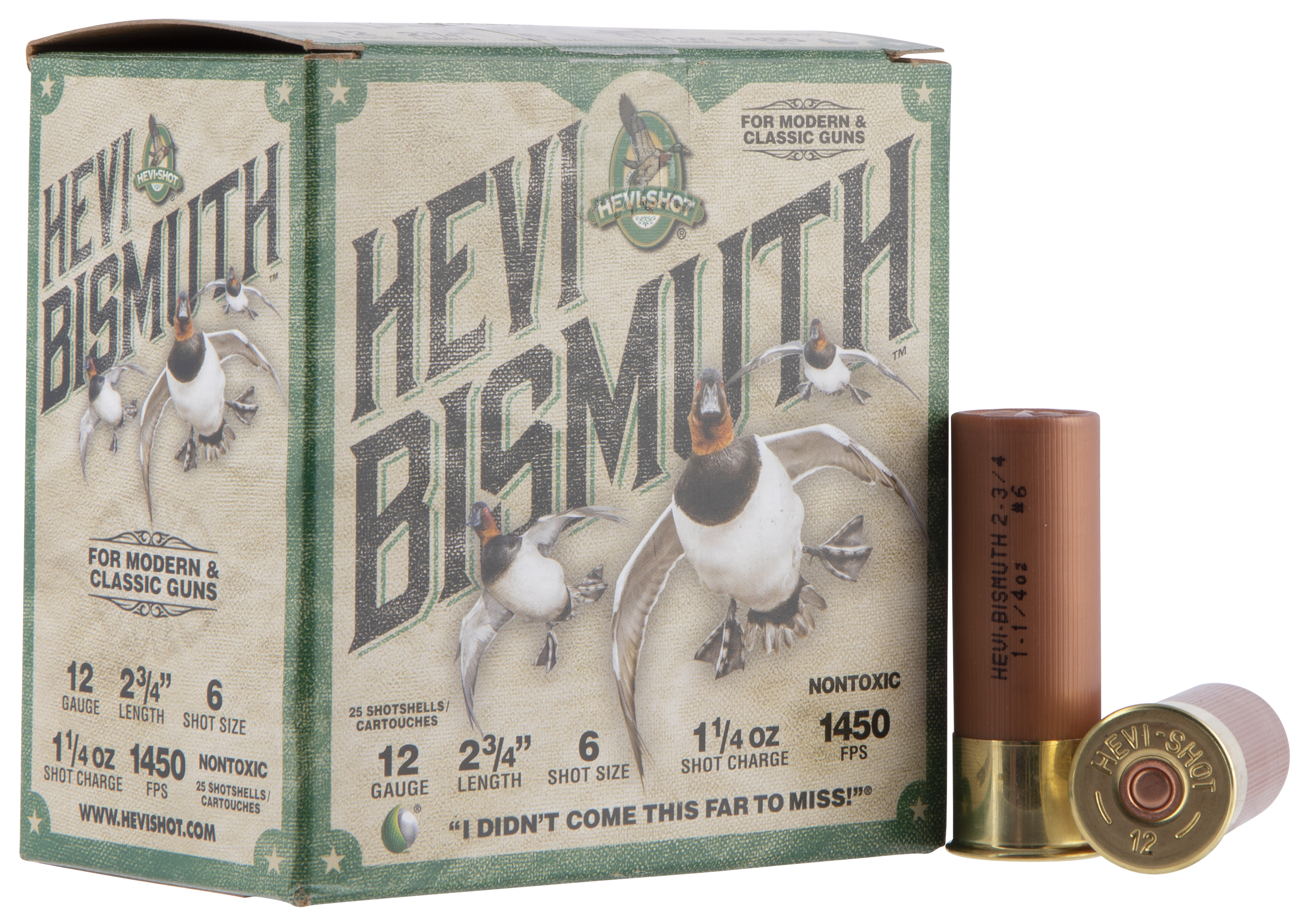 Brand HEVI-Shot Category Shotshell Non-tox Loads Model HEVI-Bismuth Series Waterfowl Gauge 12 Gauge Length 2.75" Boxes Per Case 10 Muzzle Velocity 1450 fps Ounces 1 1 / 4 oz HEVI-Bismuth Waterfowl shells utilize bismuth, which is 22% denser than steel, to deliver more downrange lethality at an affordable price. And, its safe for older fixed choke and fine classic doubles shotguns.