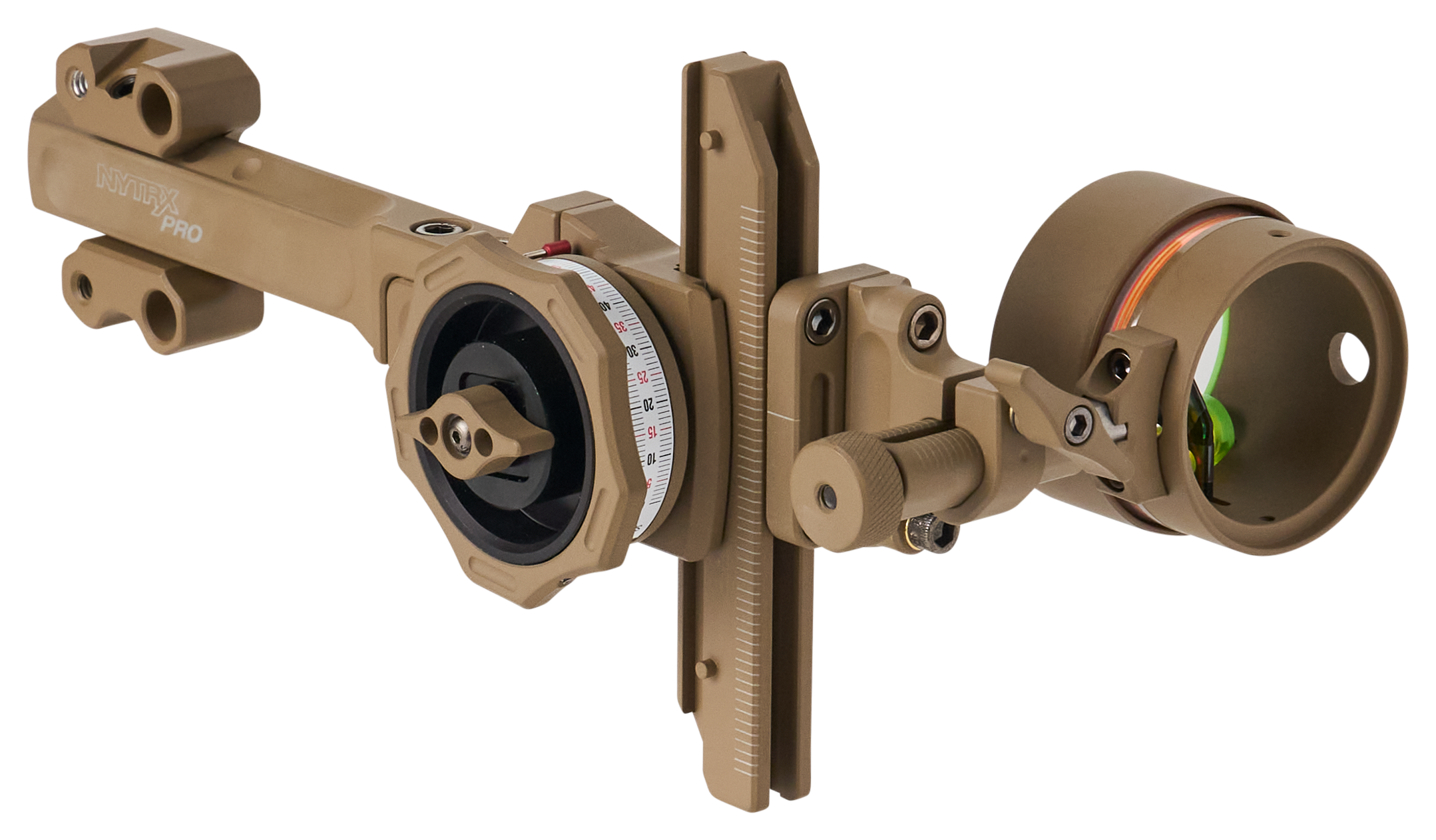 NYTRX™ versatility made for even longer distance targeting, the HHA Sports® NYTRX PRO X2 2-Pin Bow Sight with Dovetail Mount pairs a clear sight picture and precise aiming with easy-to-use adaptability. Merging NYTRX versatility with the aiming flexibility of a dual-pin, single-blade sight, the NYTRX PRO offers the amazing versatility of the NYTRX system with key additions for accurate targeting at even greater distances. This sight lets bowhunters switch easily between scopes and indicators to give bowhunters complete control over their sight setup to match changing seasons and situations. A wheeled design for quick and easy to-the-yard adjustment, this advanced sight features a repositioned gear rack that lets archers zero out the scope so the entire yardage wheel can be utilized to maximize your targeting range. Paired with the included Long Distance Tapes (the longest-distance tapes HHA has ever offered), this new system helps bowhunters target further distances than ever before. The NYTRX PRO also allows bowhunters to switch out its removable yardage wheels for a quick swap to match different hunting situations or arrow setups. Sight features completely independent 2nd- and 3rd-axis adjustments for optimized long-range accuracy, along with 1st-axis adjustment to keep the sight rail traveling level to your bow. Two-stage windage adjustment offers both macro and micro adjustment for precise tuning. ARMOR pin carrier offer total fiber protection for the sight's pins. A mechanical rheostat gives you fiber optic brightness control for low light situations. Precision dovetail mount offers extended adjustability. Comes with 2 yardage wheels and multiple waterproof yardage tapes.