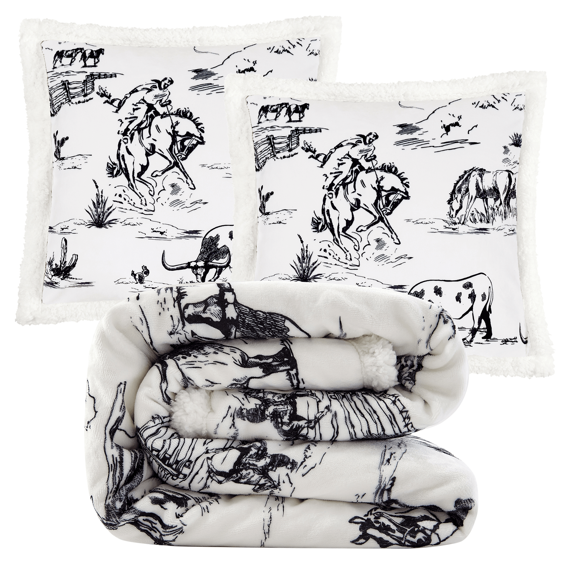 Immerse yourself in the charm of the Old West with the HiEnd Accents® Ranch Life Western Toile Campfire Sherpa Throw Set. The throw blanket and decorative pillows feature vivid depictions of courageous cowboys, peaceful grazing herds, and other frontier denizens, encapsulating the essence of ranch life. They're part of HiEnd Accents popular Campfire Throws Collection. Set includes 1 throw (68"L x 54"W), and 2 pillows (18"L x 18"W). Both items are made with a 100% polyester front and a 100% polyester sherpa back. Machine wash in cold, tumble dry on low. Imported.