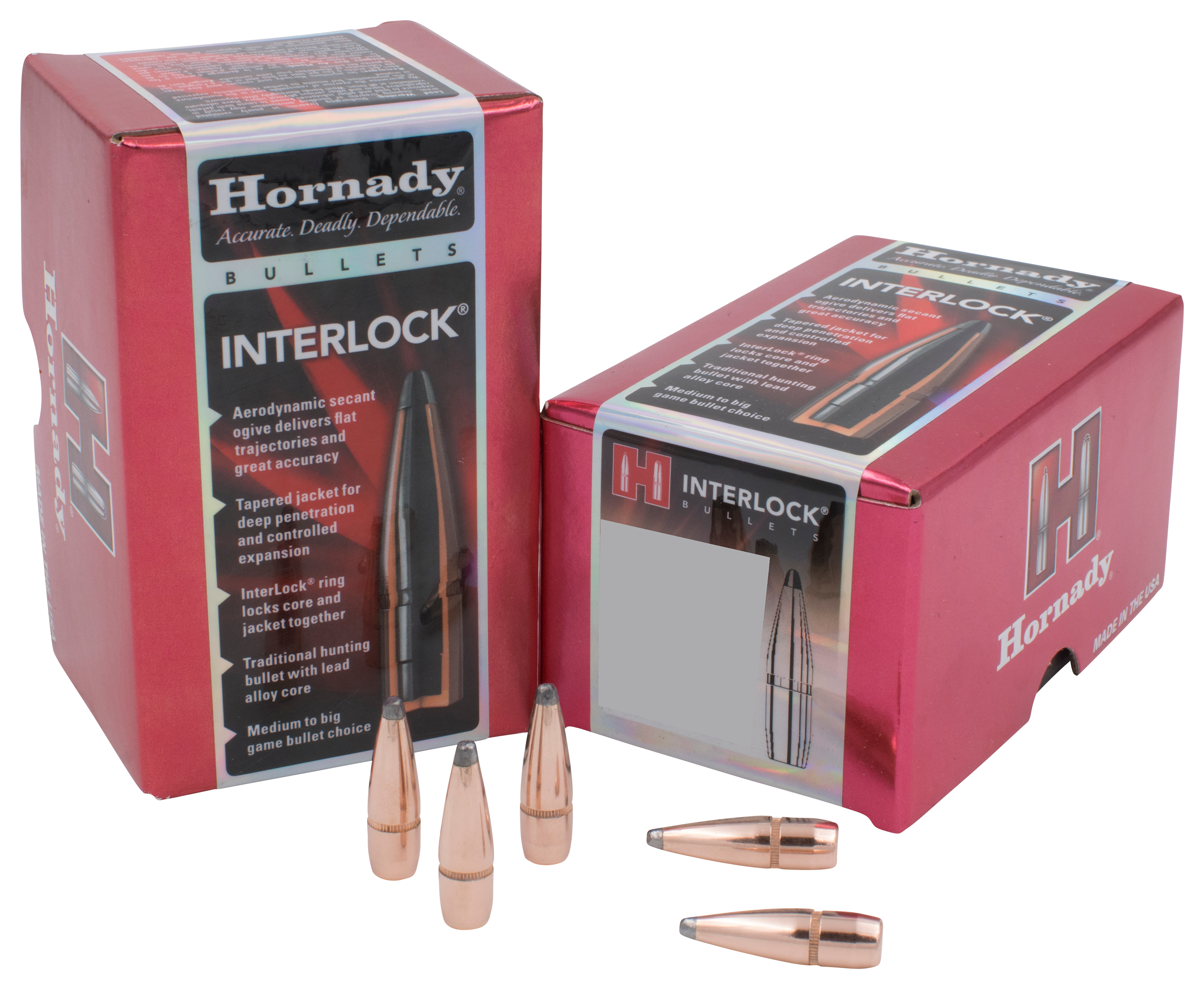 Designed for optimal performance at distance, Hornady® InterLock® Rifle Bullets come equipped with a ring embedded in the bullet's core, which locks the core and jacket together for better energy retention. This Hornady-exclusive InterLock ring also ensures perfect expansion during impact, which makes it a great hunting bullet. Hornady InterLock Rifle Bullets also feature a ballistically efficient secant ogive design, inner grooves, and a tapered jacket.