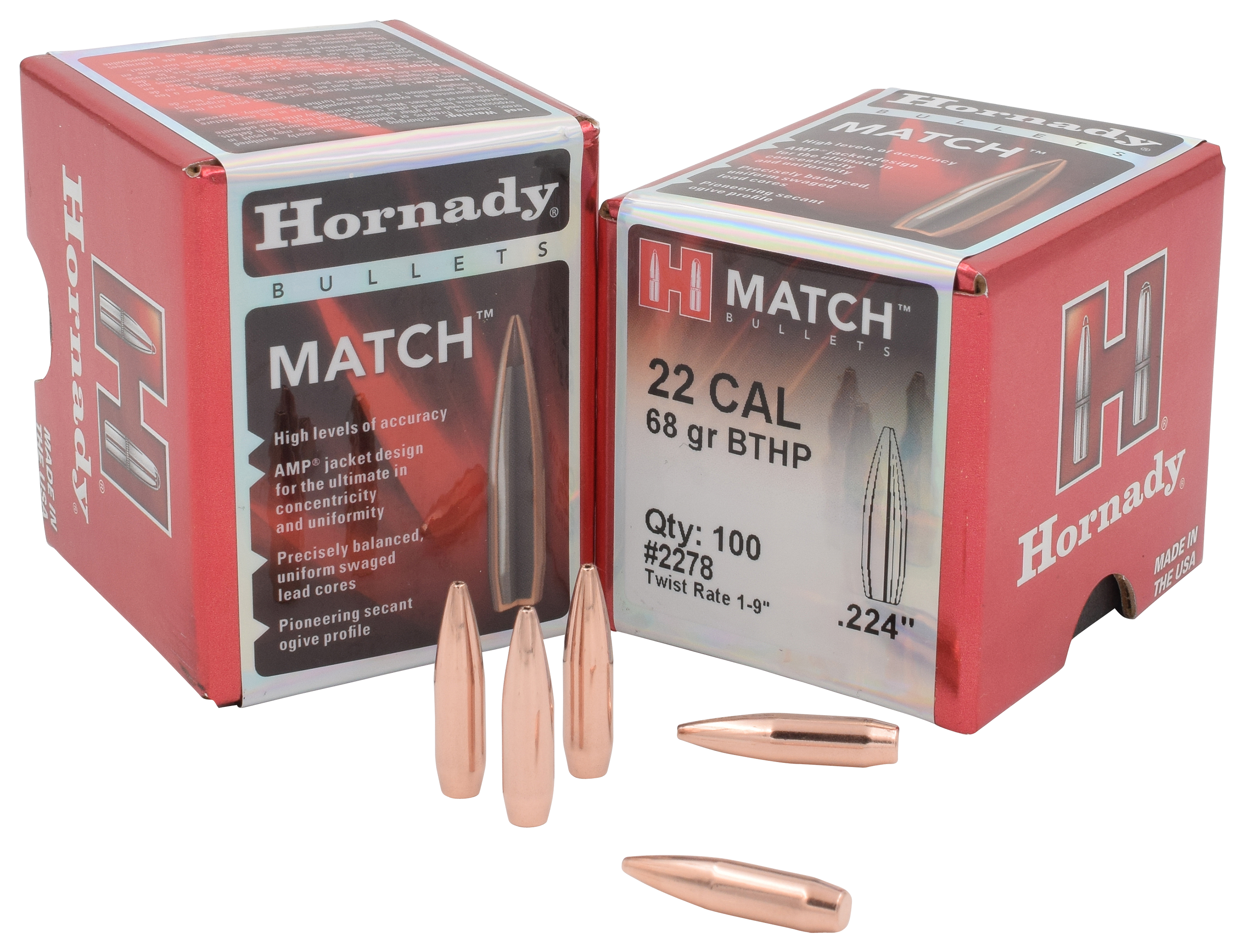Enjoy astounding long-range accuracy at the range with Hornady® Match™ Bullets. Made with Hornady's Advanced Manufacturing Process (AMP) bullet jackets, these bullets feature virtually zero tolerance for concentricity and near zero jacket wall thickness variation. The bullet's precision swaged lead core provides additional uniformity and concentricity, while its Secant Ogive Profile delivers low drag and flat trajectories for better long-range accuracy. The Hornady Match Bullets feature a boat tail design that maximizes the bullet's ballistic coefficient to give you the best numbers Hornady offers. It all adds up to unmatched accuracy at long ranges. Recommended muzzle velocity range: 2000+ fps.