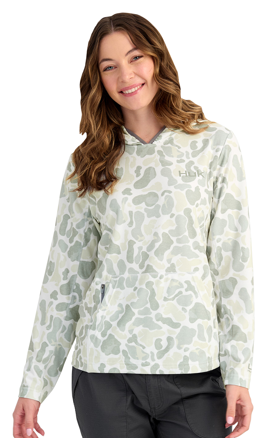 The Huk® Coldfront KC Print Long-Sleeve Hoodie for Ladies delivers easy-wearing comfort with fresh style. The 43% polyester/43% recycled polyester/14% spandex construction is double brushed for supersoft comfort, while the built-in stretch allows you to move freely. This Huk hoodie has a built-in hood for full coverage, and its kangaroo pocket boasts a secure zippered closure. Finished with KC Scott artwork. Machine wash. Imported. Manufacturer style #: H6130037.