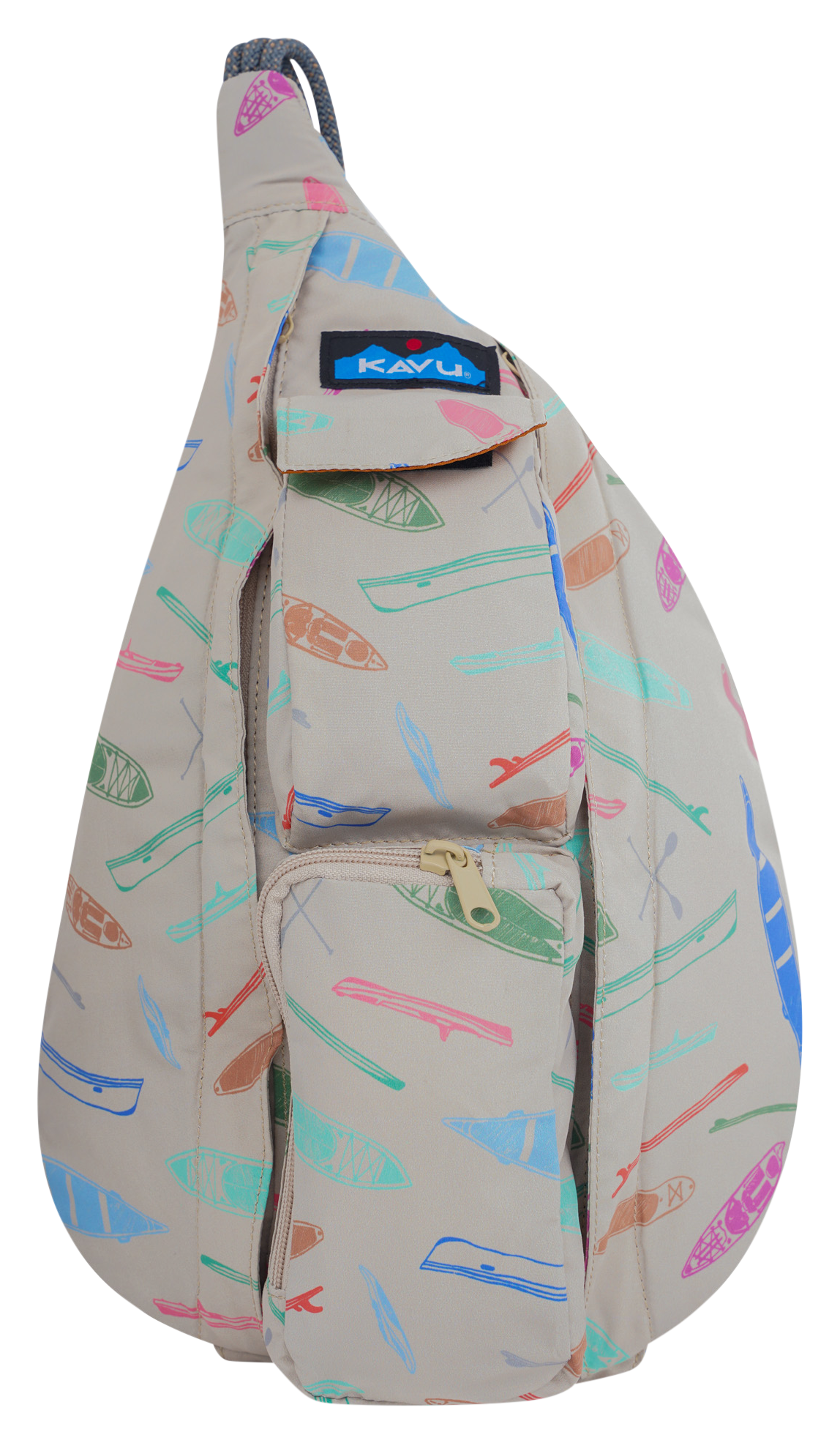 The KAVU® Mini Rope Sling Bag is your essential go-to sling pack that functions as a casual handbag or small backpack. It features the signature adjustable rope shoulder strap with a comfortable, padded back panel and KAVU logo embroidery. 2 vertical zip compartments hold the majority of your essentials, with 2 exterior easy-access pockets for your cell phone or keys. The KAVU Mini Rope Sling Bag is made of ultra-durable 100% polyester with a fun, all-over print. 16"L x 9"W. Imported.