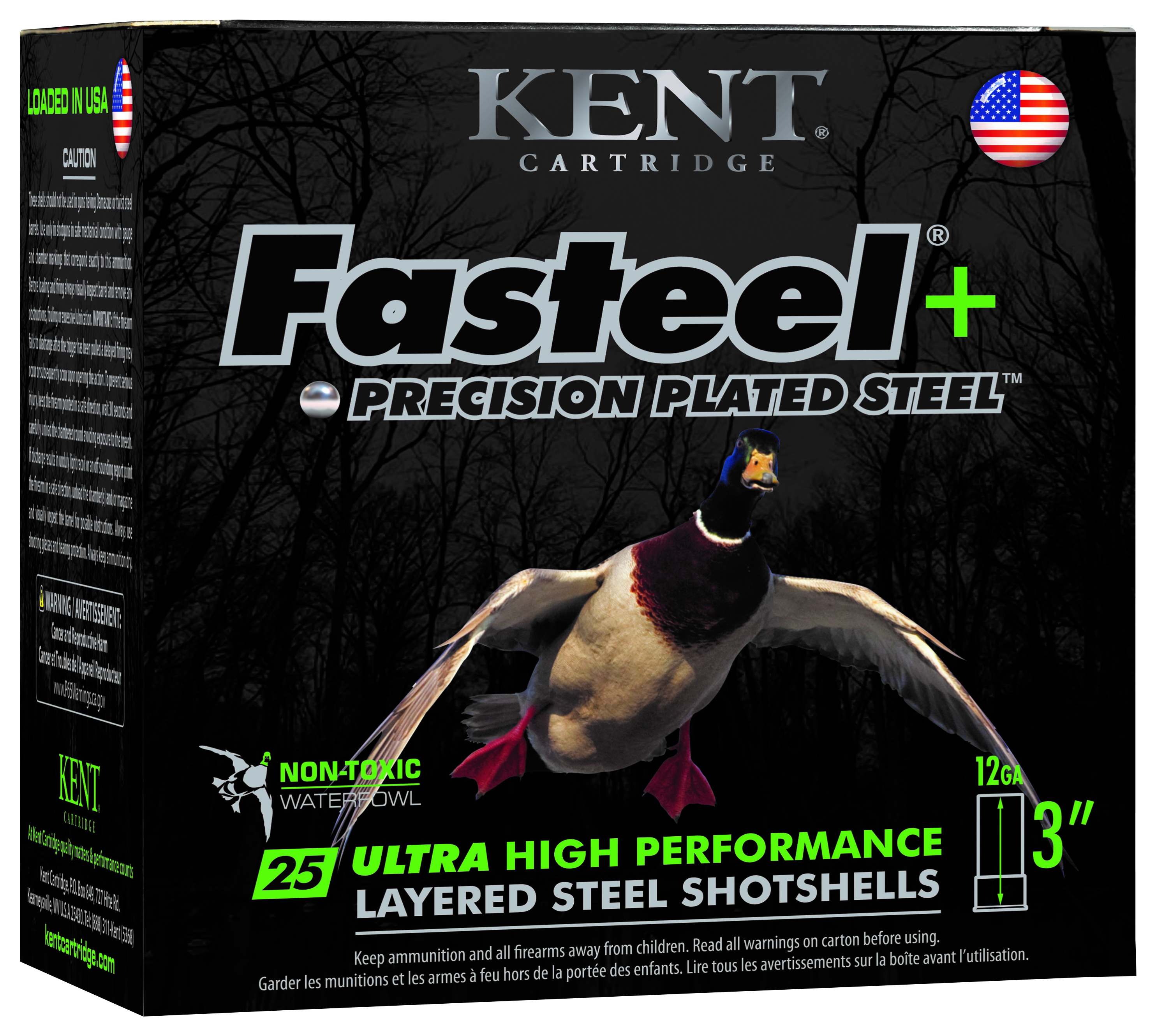 Kent® Fasteel+® 12-Ga. 3" 1-1/4 oz. Precision Plated Steel Shotshells are loaded with a high-performance base wad, custom-blended double base powder, the incredibly-reliable CD2000 primer, and a premium wad. Kent adds a binary load with 2 layers of precision-plated steel in different sizes. This allows the smaller shot to draft behind the larger shot and keeps your pattern tighter, giving you devastating pattern density at high velocities.
