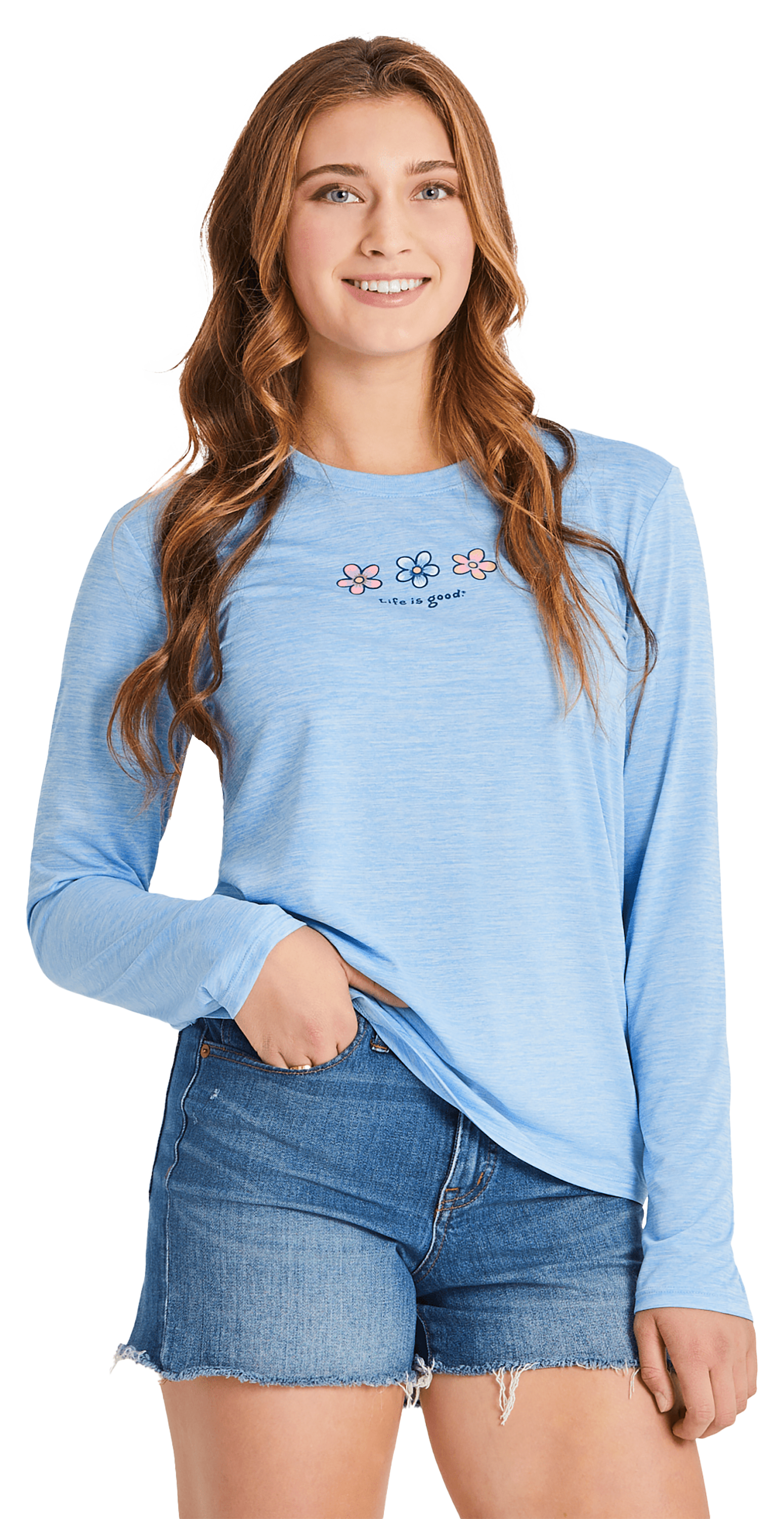 Every sunny day deserves the good vibes of the Life is Good® Tie-Dye Spatter Sun Crusher Long-Sleeve T-Shirt for Ladies! UPF 50 sun protection helps safeguard your skin from harmful UV rays, so you can spend more time basking worry-free. Lightweight 50% recycled polyester/50% polyester fabric wicks away moisture and dries fast, ensuring you feel your best under sunny skies. Plus, flatlock seams with soft sewing thread provide chafe-free comfort. This sun shirt also features spandex ribbing at the collar and self-fabric taping. Machine wash. Imported. Manufacturer style #: 129346.