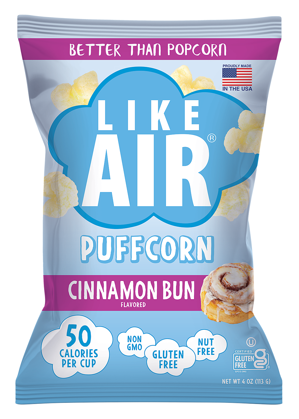The Like Air® Cinnamon Bun Puffcorn keeps snack time light but brings delectable sweetness! Bursting with freshly baked, cinnamon-y goodness, this melt-in-your-mouth snack tastes just like popcorn with a sweet twist, but without hulls or kernels.