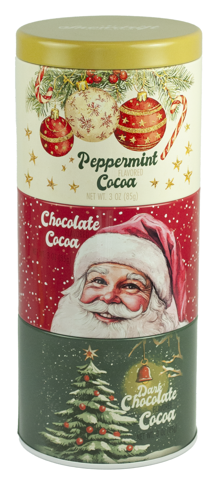McSteven's® Classic Cocoa Mix 3-Can Gift Set is sure to delight! It boasts 3 crave-able flavors, including chocolate cocoa, dark chocolate cocoa, and peppermint cocoa. Stir the cocoa powder into hot water or milk and enjoy a steaming, creamy cup of hot chocolate! Classic artwork on the packaging for a nostalgic look and feel.