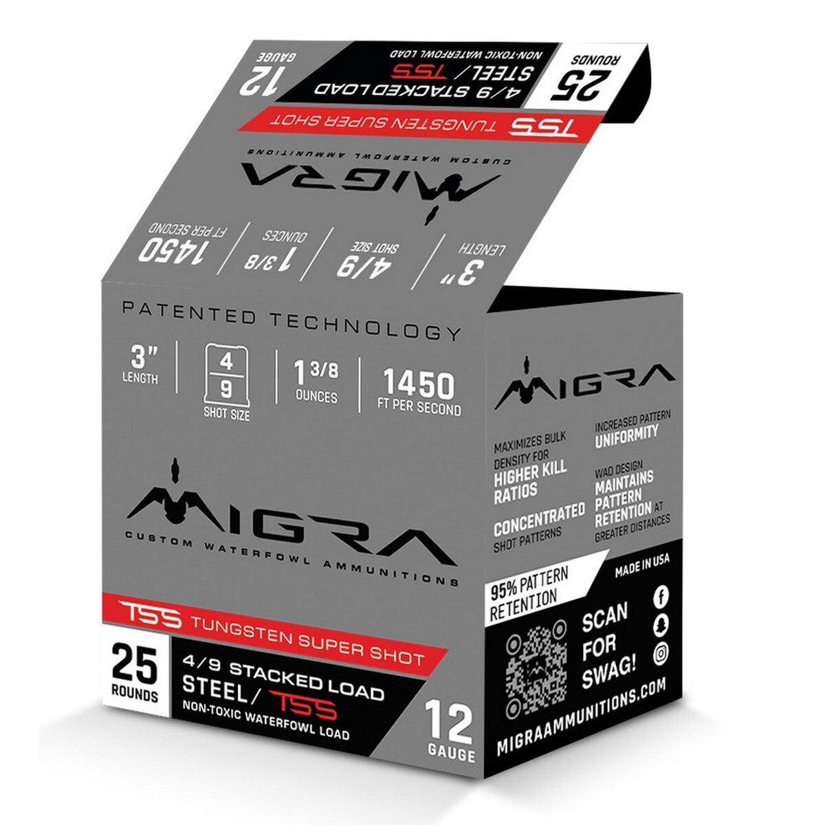 Migra Stack Load Steel/TSS Shotshells combine #4 steel shot stacked with #9 Tungsten Super Shot (TSS) to deliver incredible pattern density. Perfectly designed for waterfowl hunters with technology you can count on when you need it most. Make every shot count with Migra.