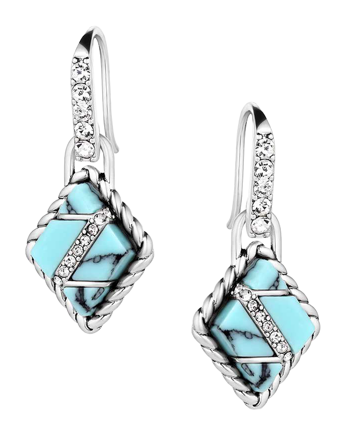 Montana Silversmiths High Noon Cobblestone Earrings blend subtle sparkle and bold, crafted turquoise for an elegant design. These Montana Silversmiths earrings have a silver-tone diamond shape with a twisted-rope border. Pieces of crafted turquoise sit on the inside. A diagonal line of clear cubic zirconia crystals through the center adds sparkle, giving the design a unique look. These earrings are secure to hinged clasps. Silver plating over a brass base with Montana Armor to prevent tarnish. Mfrs. lifetime limited warranty with receipt. .3"L x .5"W x 1.3"H.