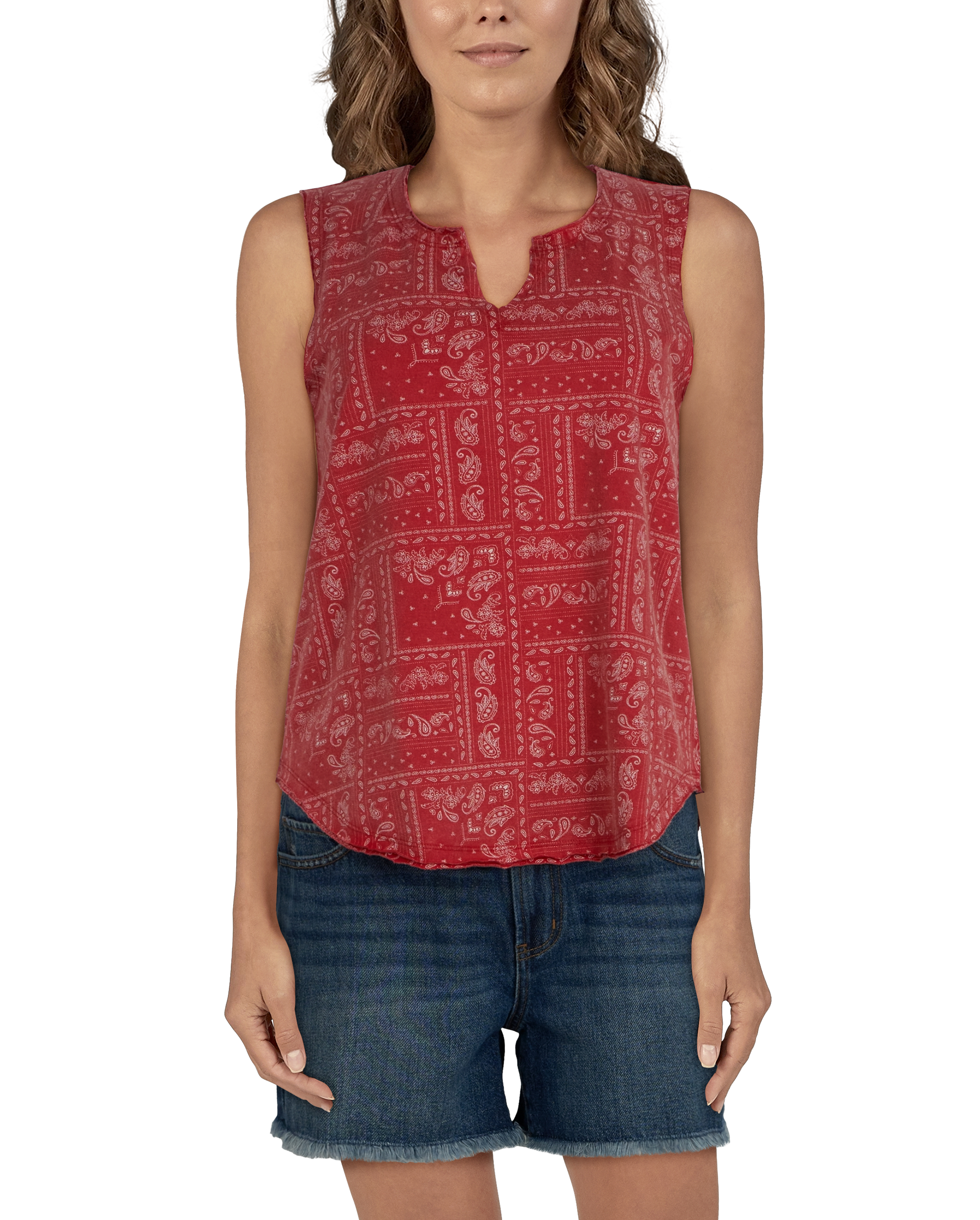 The Natural Reflections® Bandana Print Tank is a fun and comfortable top that's ready for everything from picnics and gardening to enjoying the city and taking a long hike. Made of 100% cotton slub jersey, this tank is soft and comfortable like a T-shirt. The raw-edged V-neck gives the shirt a lived-in personality. The bandana-style print makes this shirt stand out from the rest. A round hem offers more coverage during your adventures. Body Length (Based on Size M): 26". Machine wash. Imported.