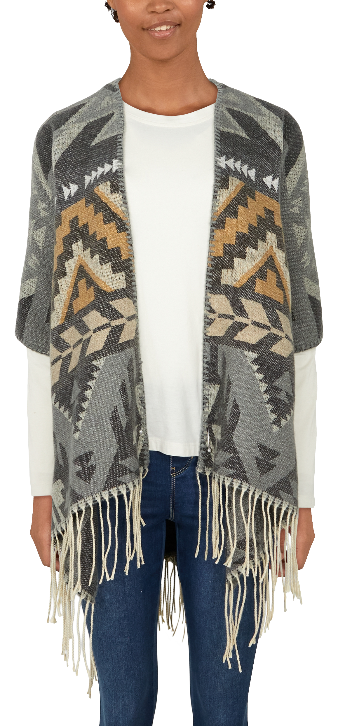 Our Natural Reflections® Glenstone Ikat Ruana brings striking style to your cool-weather outfit! It boasts varying Southwestern patterns and contrasting colors to create a look that's sure to get noticed. Plus, a fringed hem really pulls it all together! Soft 100% polyester fabric ensures you're as comfortable as you are stylish. Pair this poncho with a long-sleeve shirt and your favorite pair of jeans to complete the look! 40"L x 30"W. Armholes: 18". Machine wash. Imported.