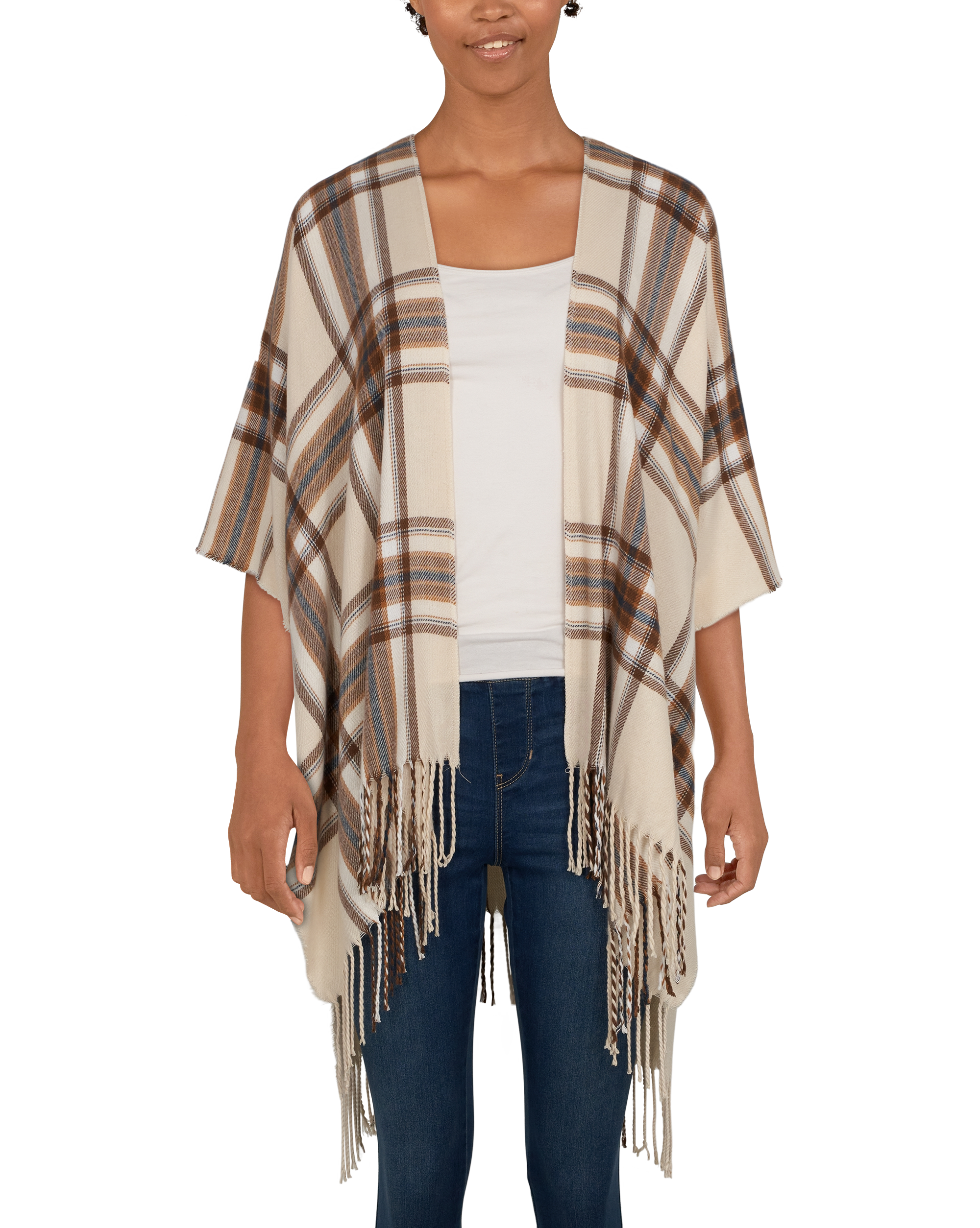 Add the Natural Reflections® Orchard Plaid Ruana for Ladies to almost any outfit – even jeans and a nice tee – and suddenly your look is elevated! This soft and flowing women's ruana from Natural Reflections features 3" fringes at the lower hem, and it adds a little extra warmth to your day. Made of 100% acrylic. Hand wash in cold. 30"L x 40"W. Imported.