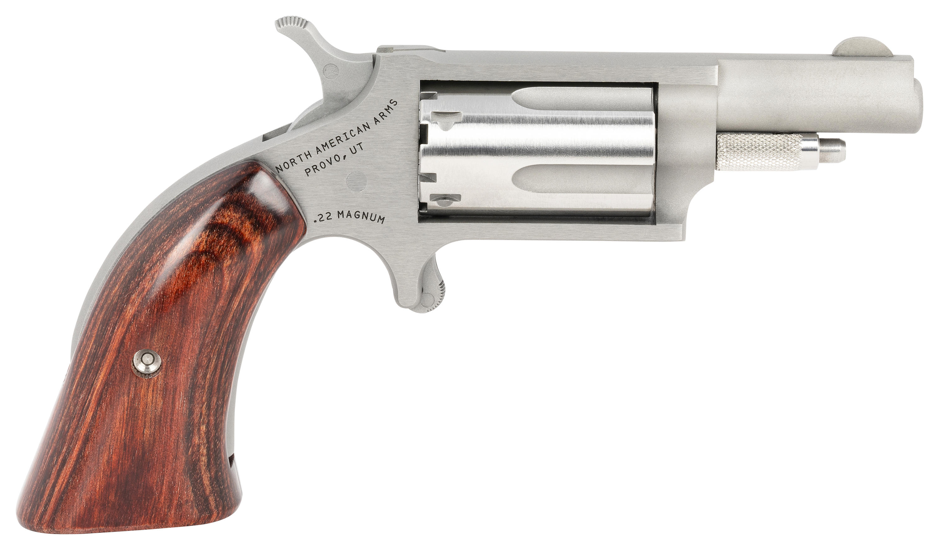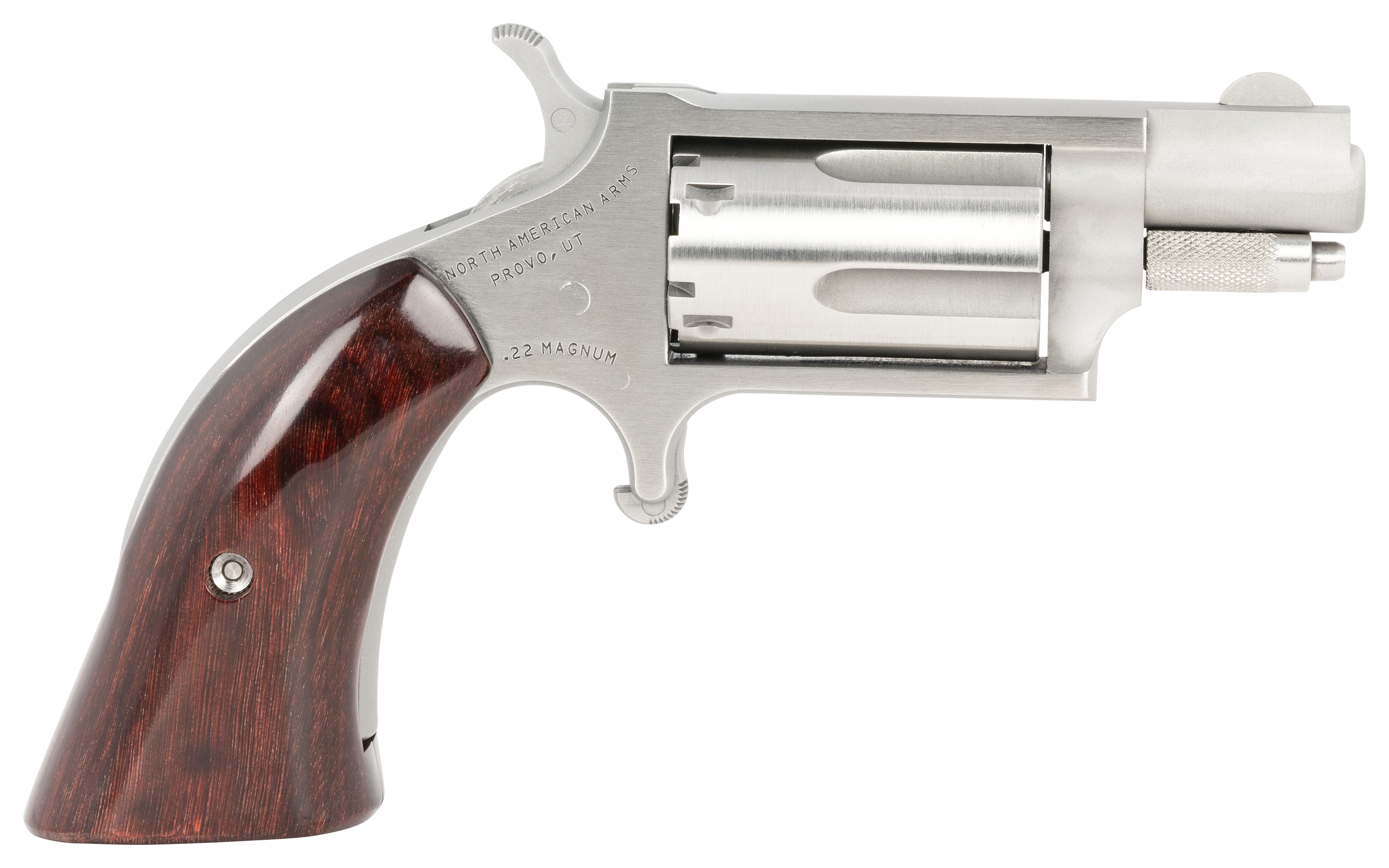 Keep your personal protection close and always ready with the North American Arms® Mini-Rev Single-Action Rimfire Revolver with Boot Grip. It packs 5 rounds of .22 Magnum (also called .22 WMR) into a highly concealable package. This mini-revolver model features a wood boot grip that gives you a little more to hold onto. Other features include half-moon sights and safety cylinder/half-notch.