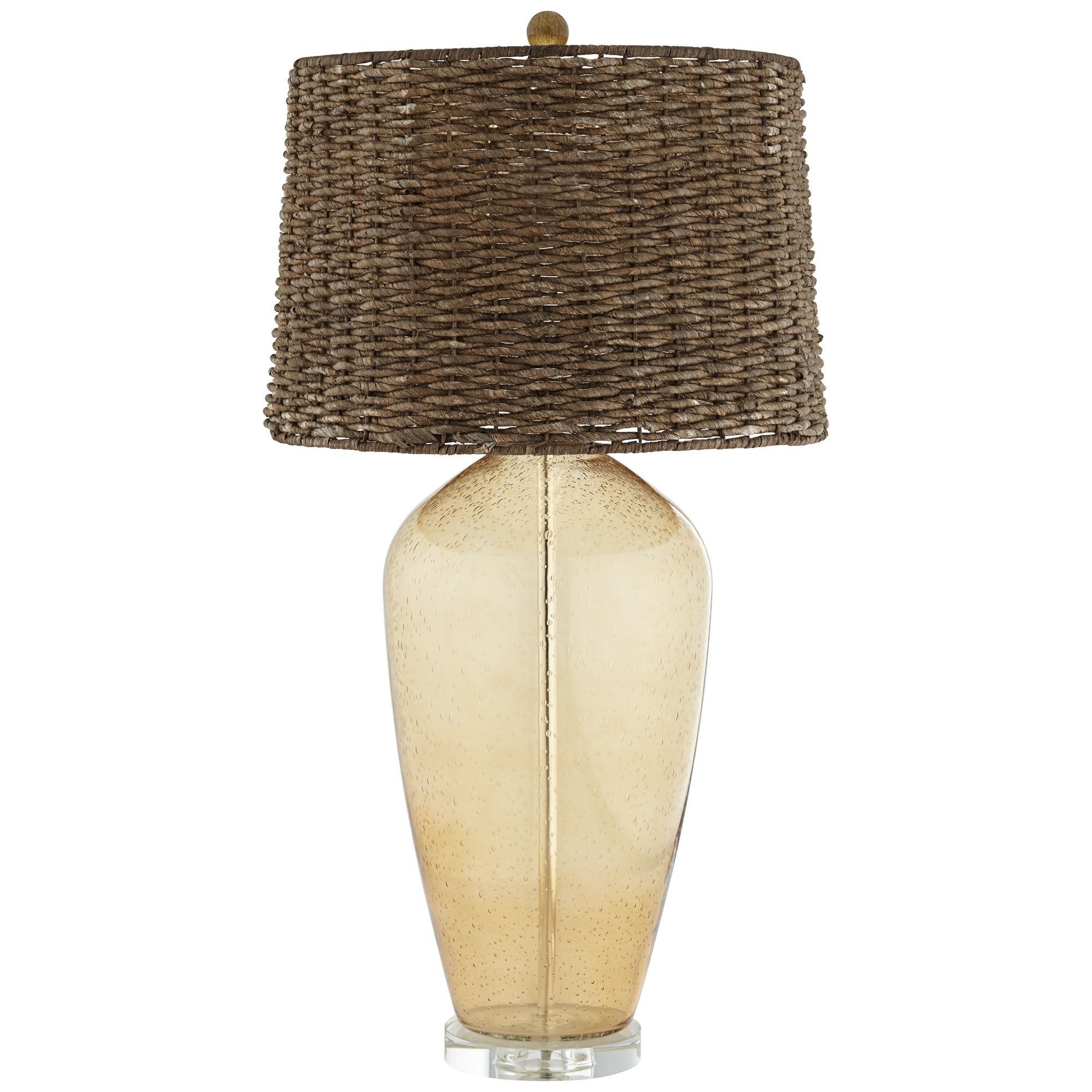 Soft earth tones add subtle character to the light tea-colored Pacific Coast® Lighting Nantucket Seedy Glass with Wicker Shade Table Lamp. A wicker shade brings a cool, rustic vibe. A clear base and polished brass harp add a subtle touch of shine to this decorative lamp from Pacific Coast Lighting. Max wattage: 150W. 30.75"H x 16"W x 16"D. Imported.