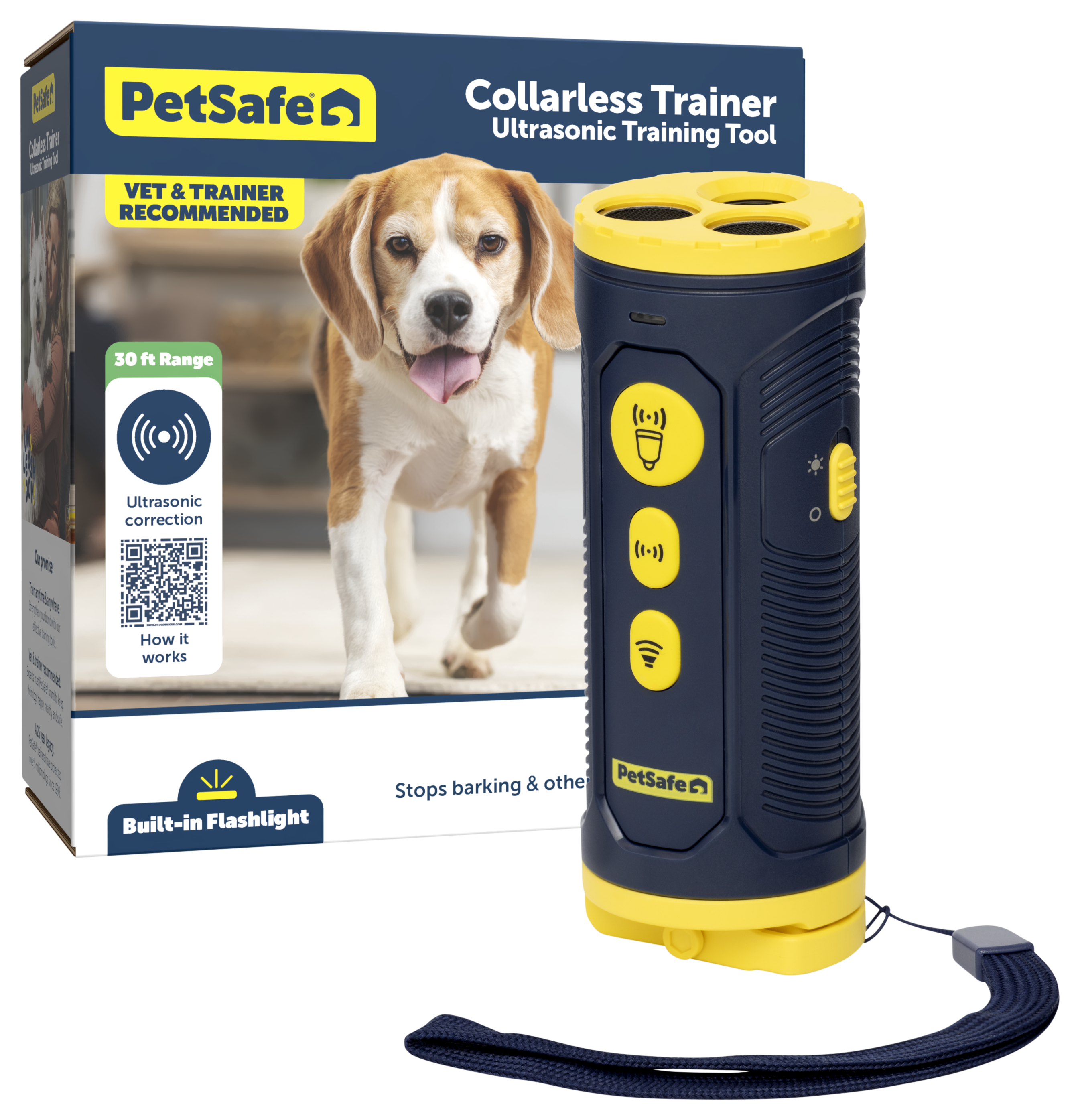 The three training modes available on the PetSafe® Collarless Trainer are designed to curb excessive barking while being safe for your dog's hearing. The fixed ultrasonic mode emits 25kHz frequency sound waves, while the variable ultrasonic mode emits 20kHz-30kHz sound waves. The device only broadcasts sound for up to 8 seconds at a time. The bright LED flashlight makes walking with your pup easy at any time of day or night.