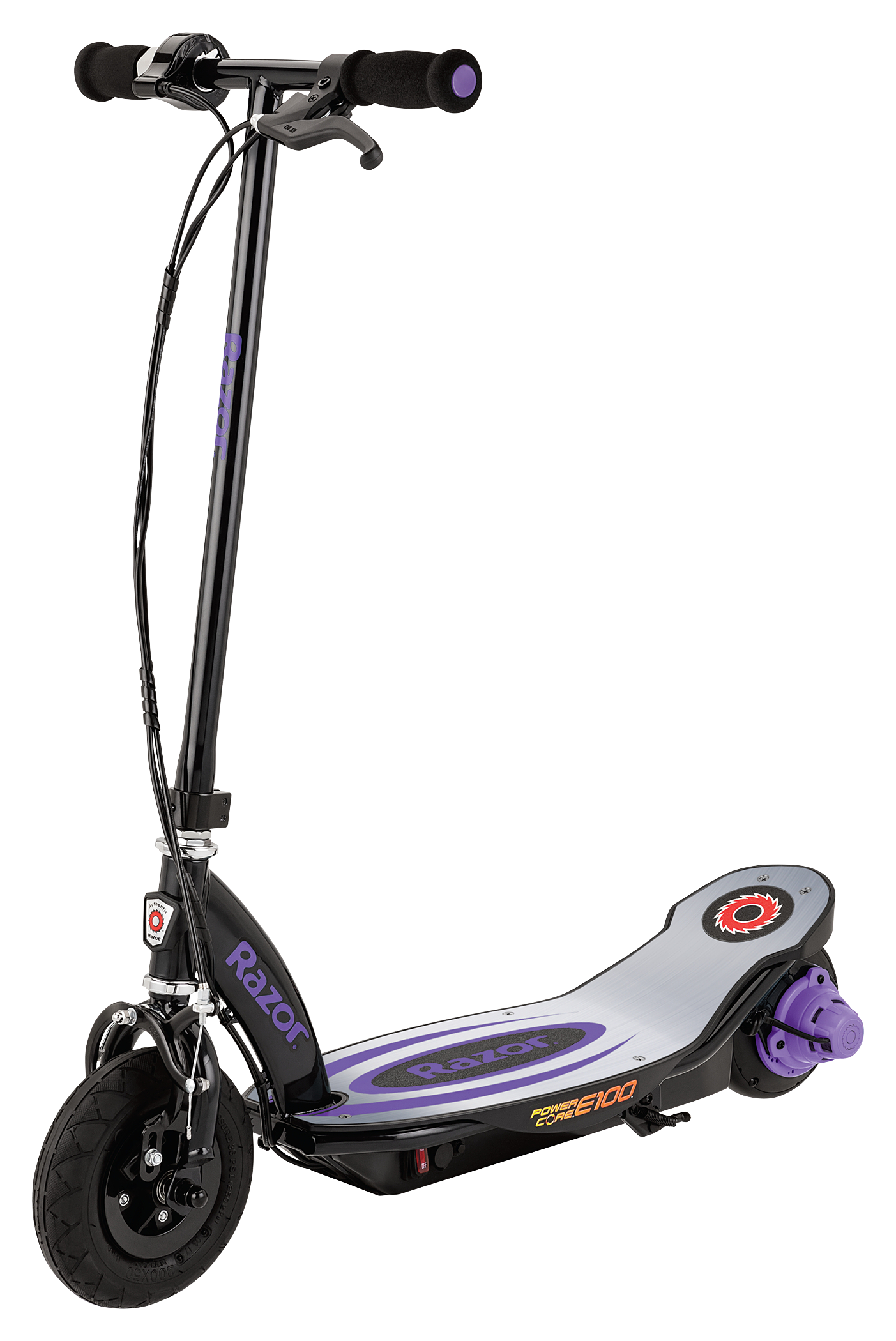 Zoom around the neighborhood on the Razor Power Core™ E100 Electric Scooter. It features a top speed of 11 mph, so your young rider can get where you're going fast. Twist-grip throttle and hand-operated front brake give them control of the scooter. The steel frame and aluminum deck offer a comfortable riding platform and act as a solid foundation. Equipped with a maintenance-free 100W, kick-to-start, high-torque, hub-driven motor with Power Core technology features 50% more torque than the Razor E100. Also features pneumatic front tire; airless, flat-free back tire; and a retractable kickstand. 2 rechargeable 12V batteries provide up to 60 minutes of continuous use. Recommended for ages 8 and up. Includes battery charger. Max. Wt. Cap.: 120 lbs.