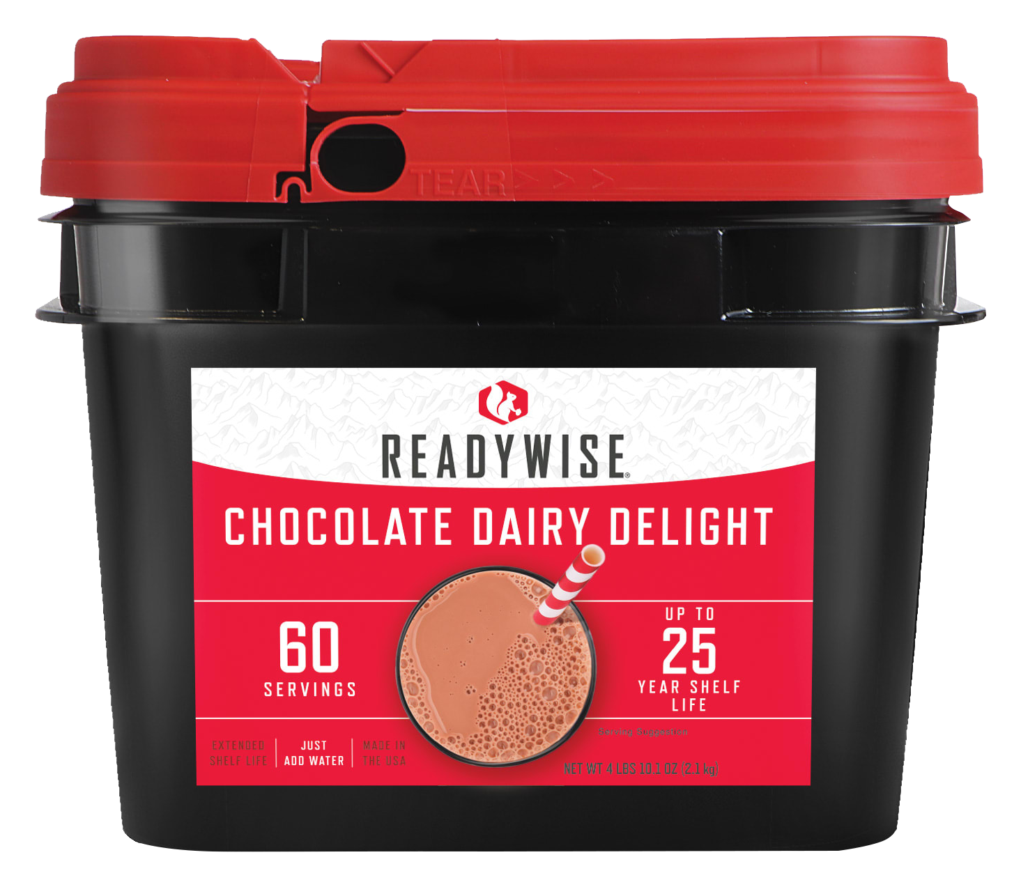 Be prepared for emergencies with a tasty treat that's full of nutrition with the ReadyWise® 60-Serving Whey Chocolate-Milk Bucket. This powdered milk is sealed in Metallyte pouches that is quick and easy to rehydrate by simply adding water. Each pouch holds 6 servings, and each serving provides 140 calories and 3 grams of protein. 25-year shelf life. Bucket includes a grab-and-go handle.