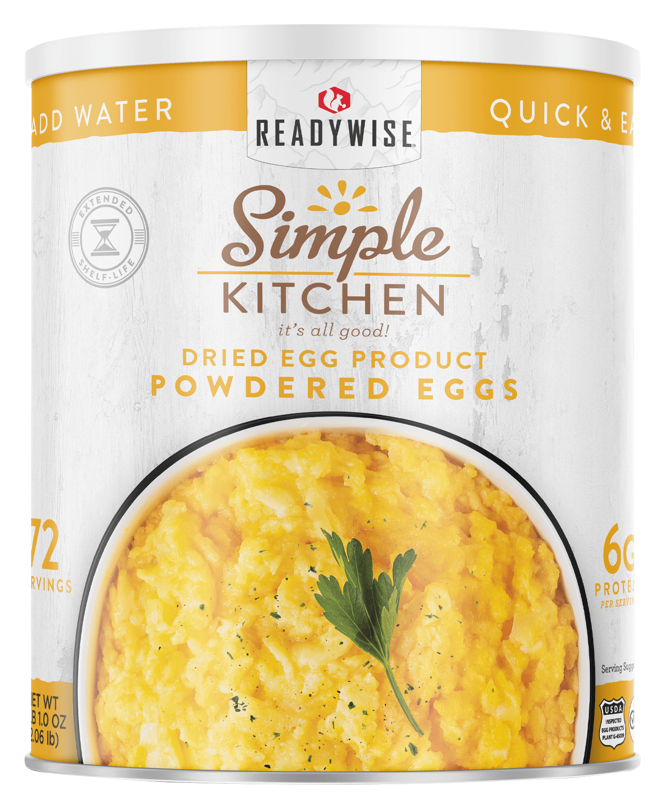 The ReadyWise® Simple Kitchen® #10-Can Powdered Eggs rehydrate quickly with water, delivering a nutritious meal in minutes. This can contains 72 servings, with each serving providing 80 calories and 6 grams of protein. The ReadyWise Simple Kitchen freeze-dried eggs are gluten free. Extended shelf life. 3-pack. Made in USA.